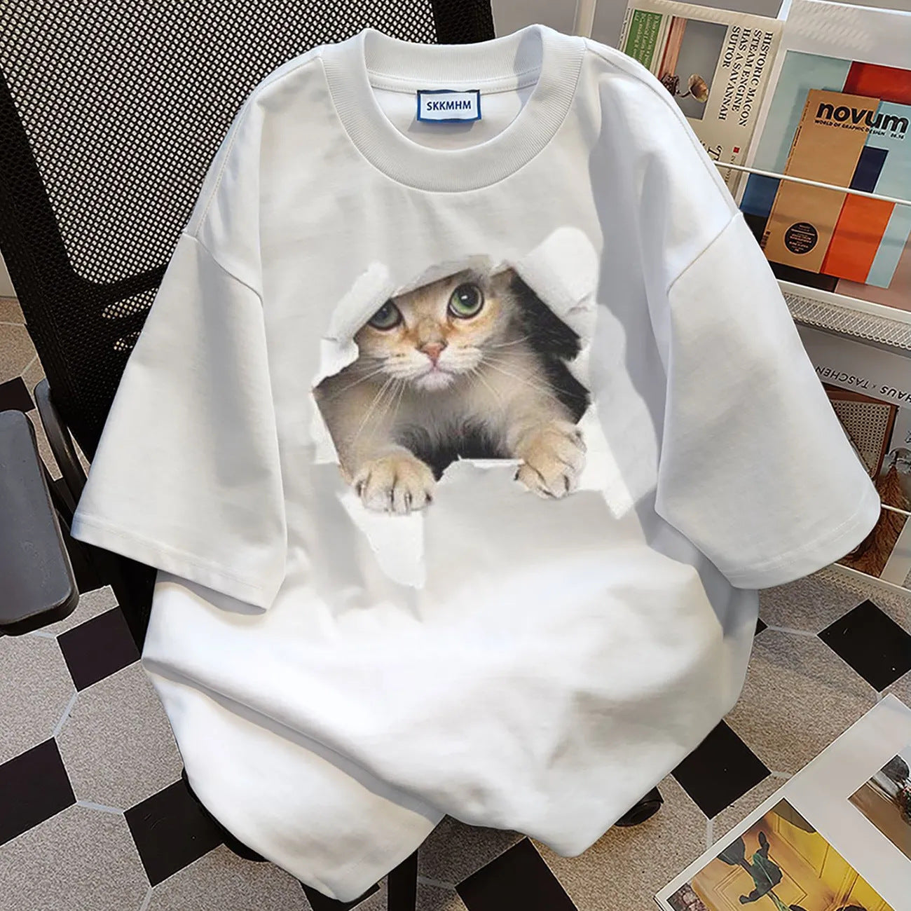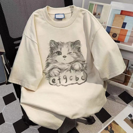 Add a playful touch to your summer wardrobe with this 100% cotton cat-printed short-sleeved T-shirt for women. Designed with a loose yet slimming fit, this casual top features a classic round neck and an adorable cat graphic that’s perfect for couples or everyday wear.