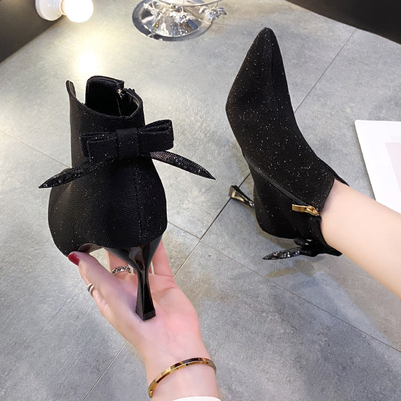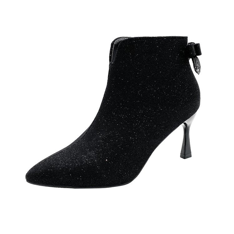 Winter Chanel-Style Women’s Short Boots. Featuring a stiletto high heel, pointed toe, and decorative bow, these Martin-style boots combine elegance, fashion, and comfort. Made with cotton lining, they keep your feet cozy during cooler seasons, available in size 42 for a perfect fit.