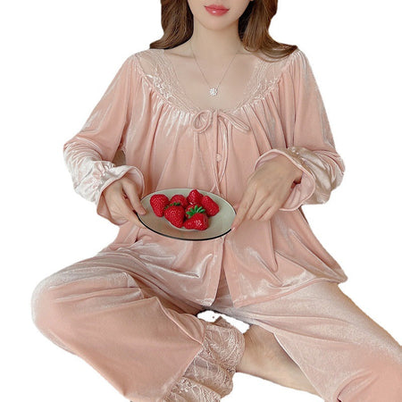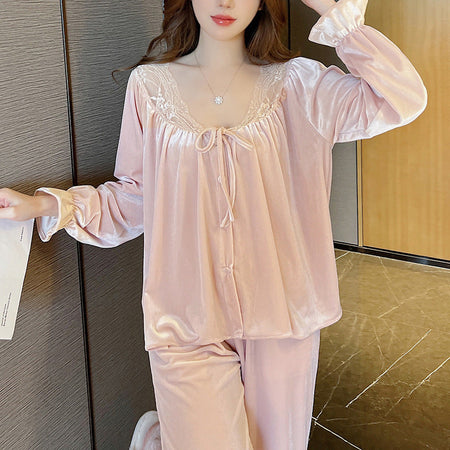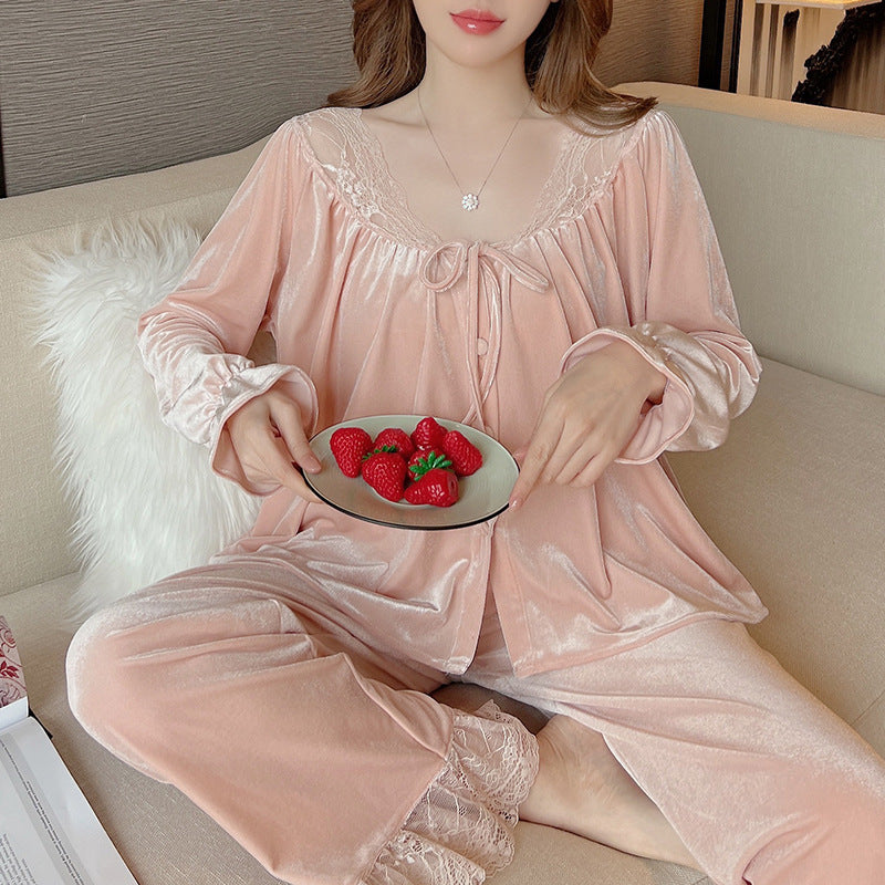 Gold Velvet Mesh Pajama Set – Women’s Spring Loungewear