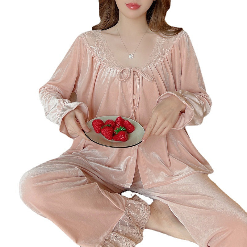 Relax in style with this 2023 Spring Gold Velvet Pajama Set, designed for comfort lovers who appreciate a touch of elegance. 🌸💤 Made with soft gold velvet and chic mesh stitching, this long-sleeve homewear suit brings together luxury and coziness for your perfect lounging experience.