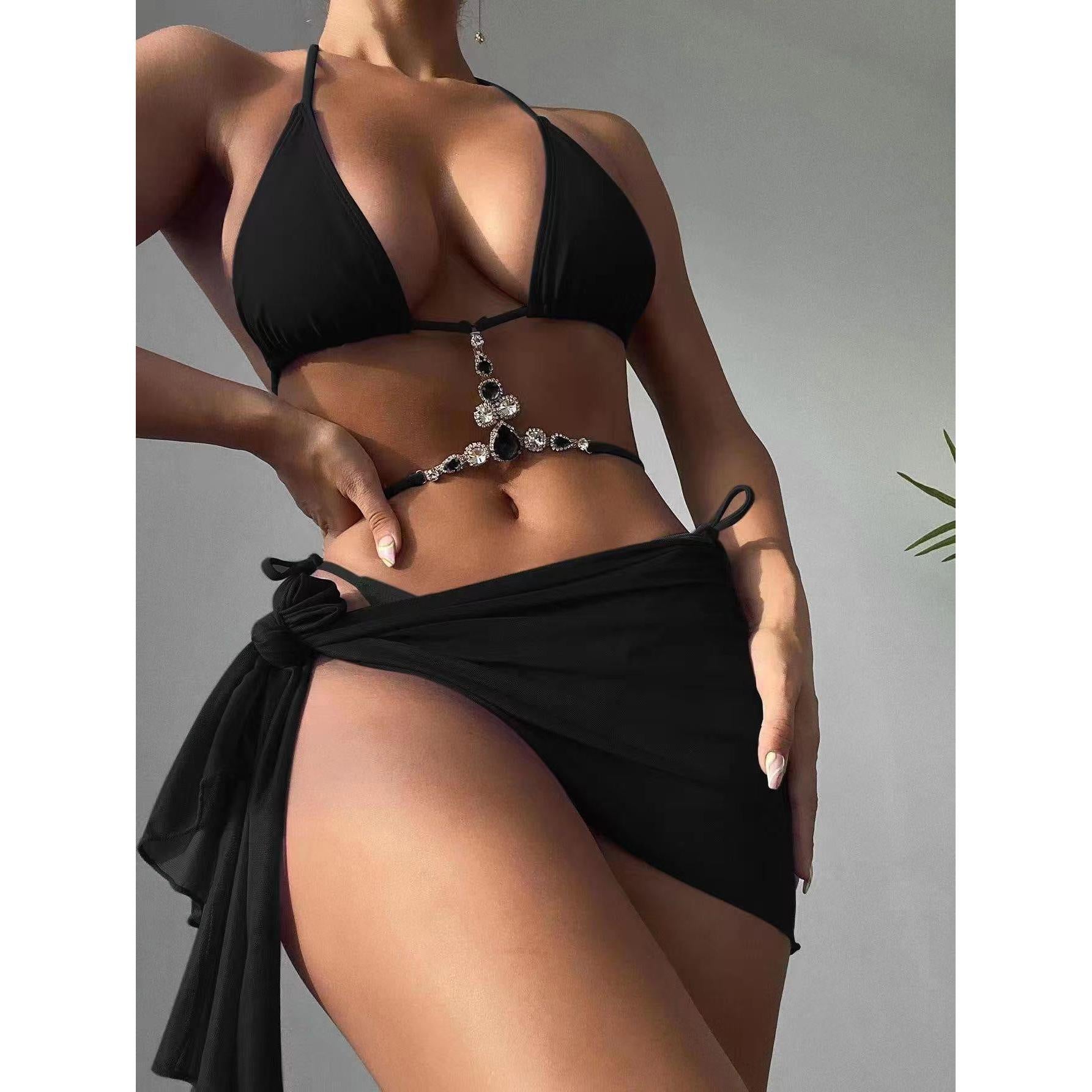 Shine with confidence on the beach or by the pool in this 2024 European & American Style 3-Piece Diamond Bikini Set. Featuring a sexy mesh cover-up, a sparkling diamond-accented bikini, and a coordinated top and bottom, this swimsuit delivers the perfect blend of glamour and comfort.
