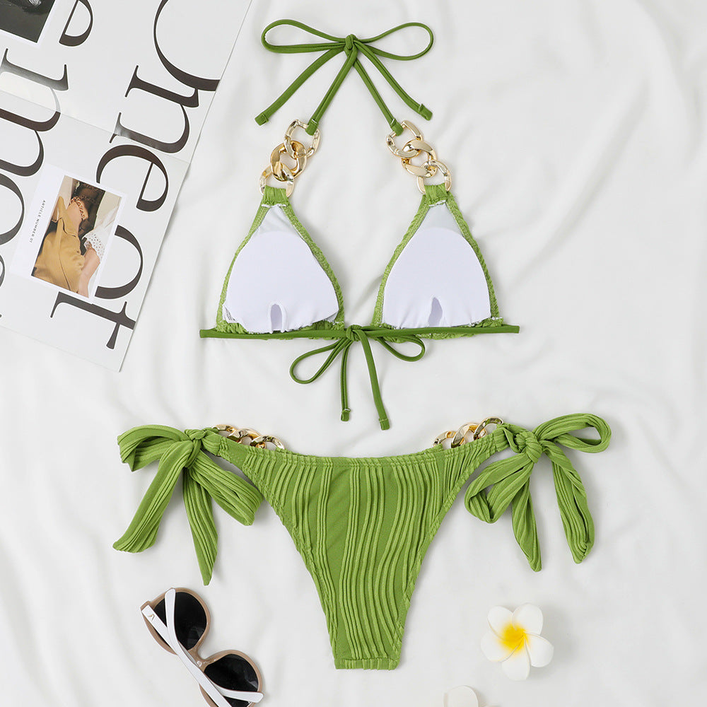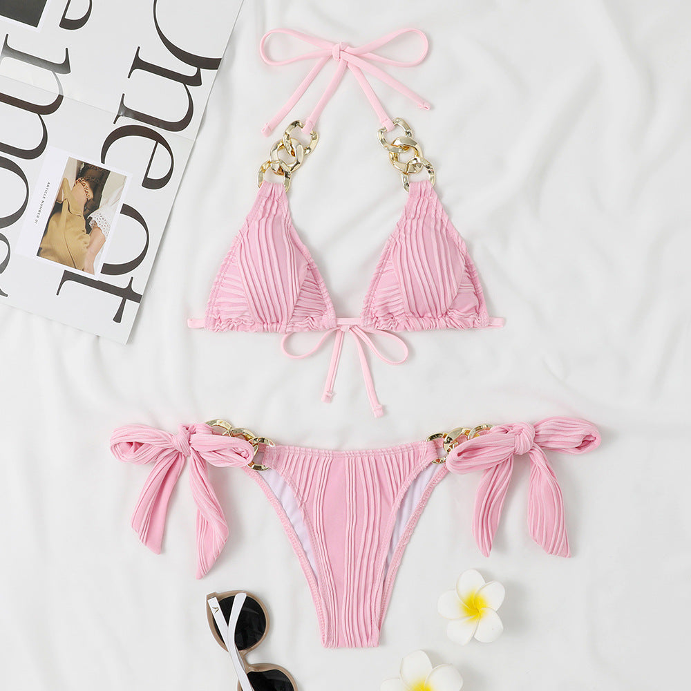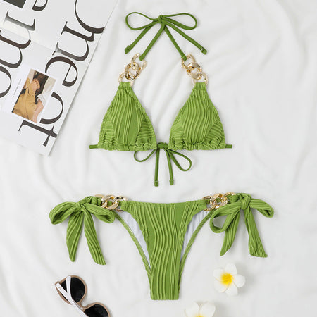 This solid color bikini set features a flattering lace-up design and metal hanging ring accents, offering the perfect blend of minimalist style and bold detailing.