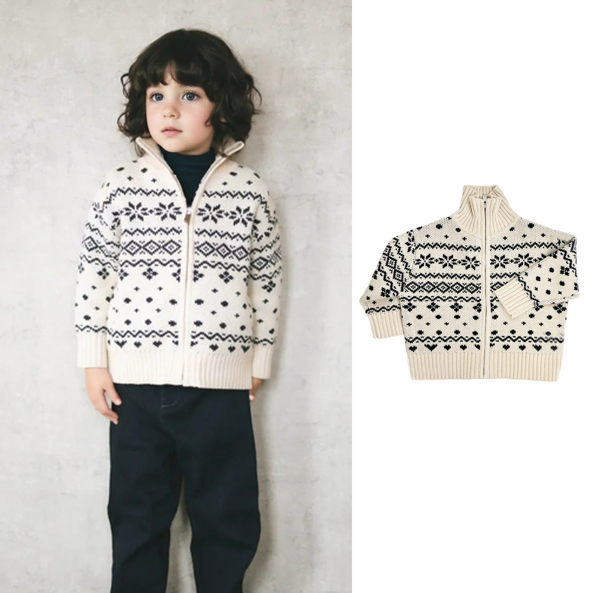 Keep him snug and stylish 👦🧥 with this high-neck Fair Isle knitted cardigan. Designed with all-match versatility, it’s perfect for autumn 🍂 and winter ❄️ wear.