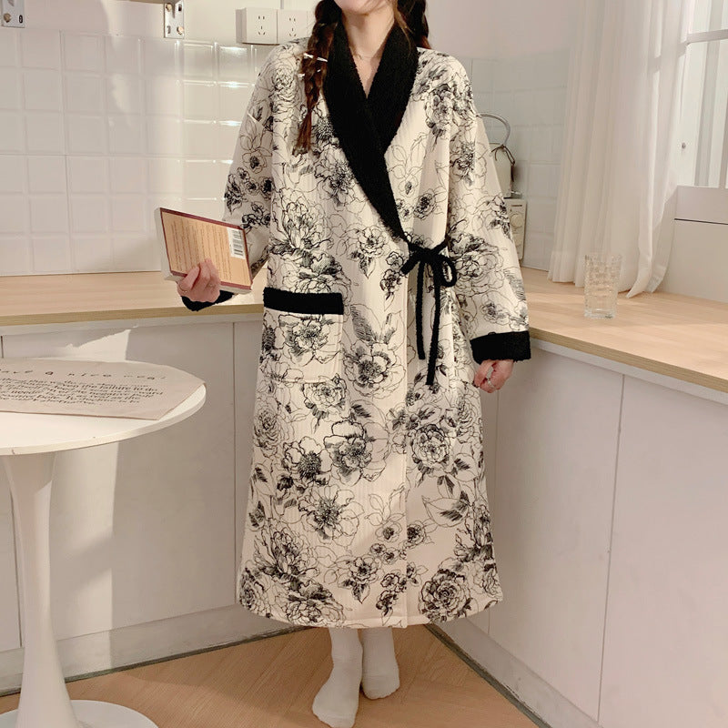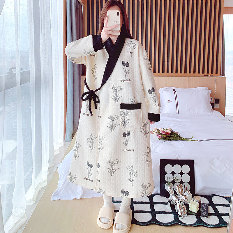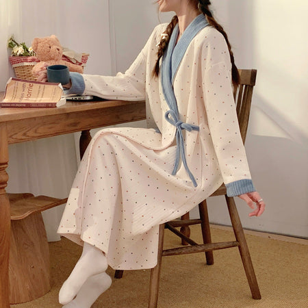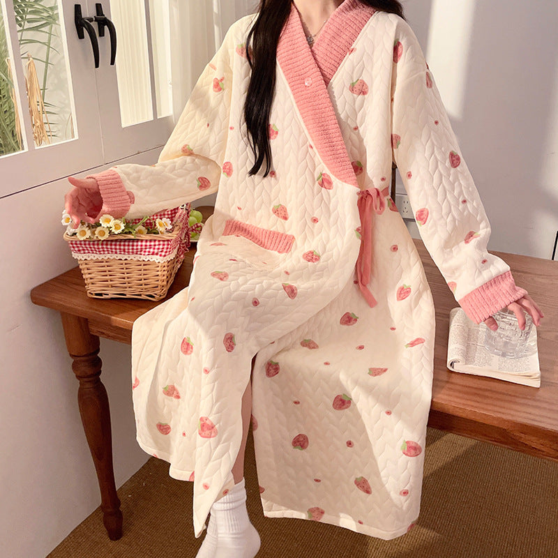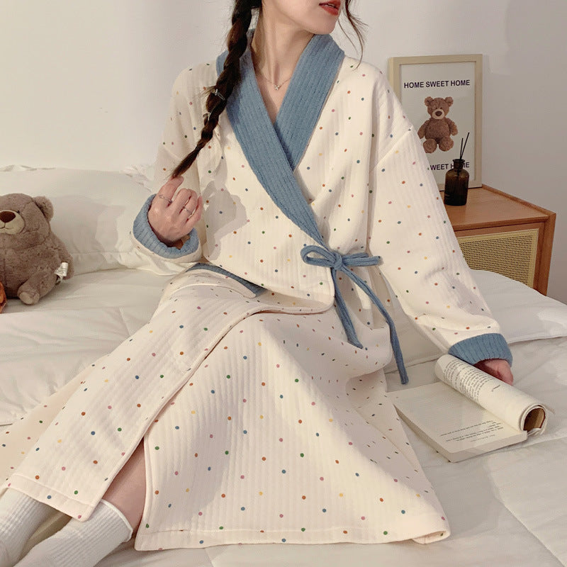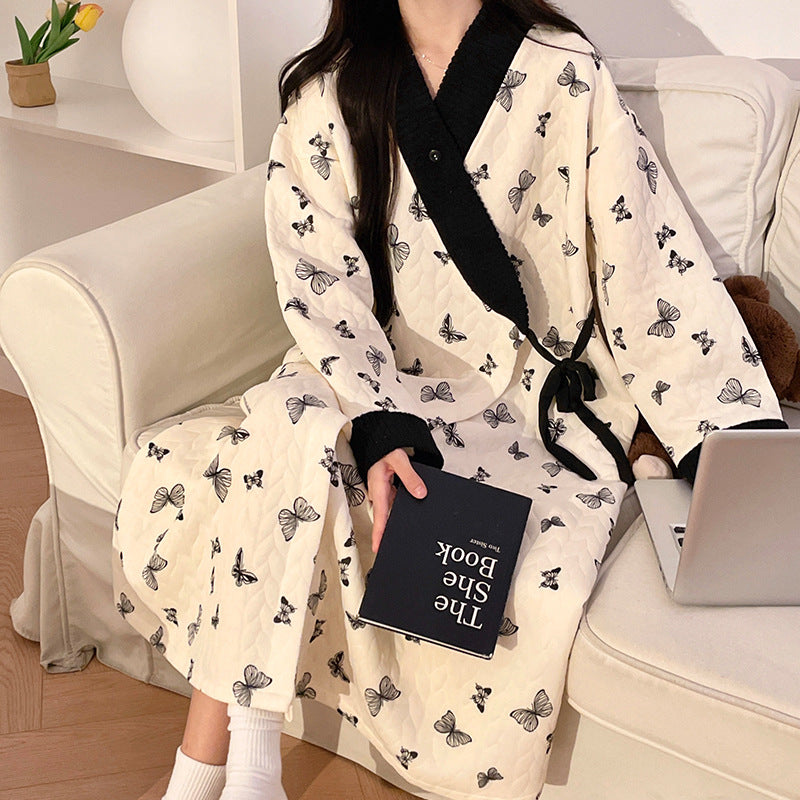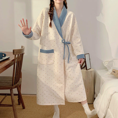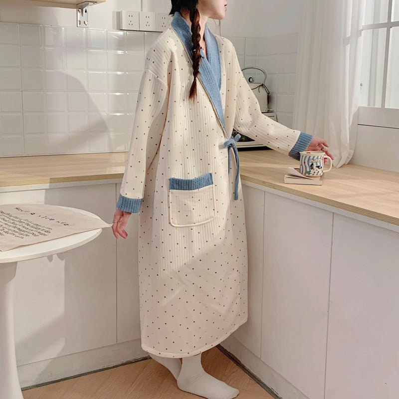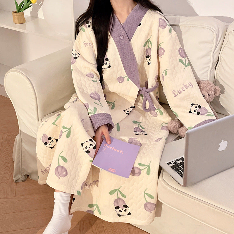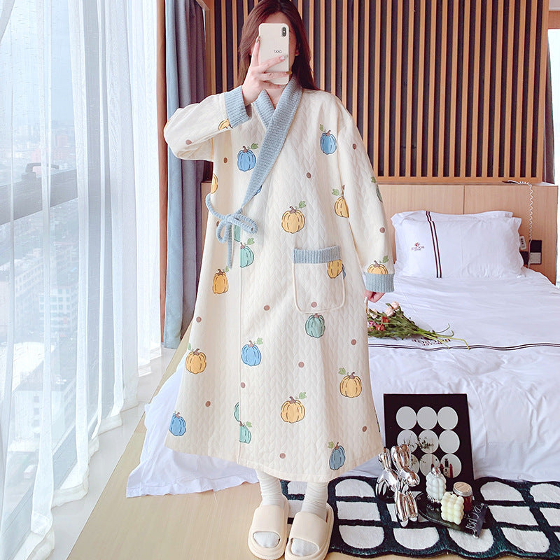 Stay cozy and stylish in the Autumn & Winter Sandwich Air Cotton Nightgown, designed for pregnant and nursing mothers. Its soft fabric and tie-up front make feeding easy while keeping you warm through cooler seasons.