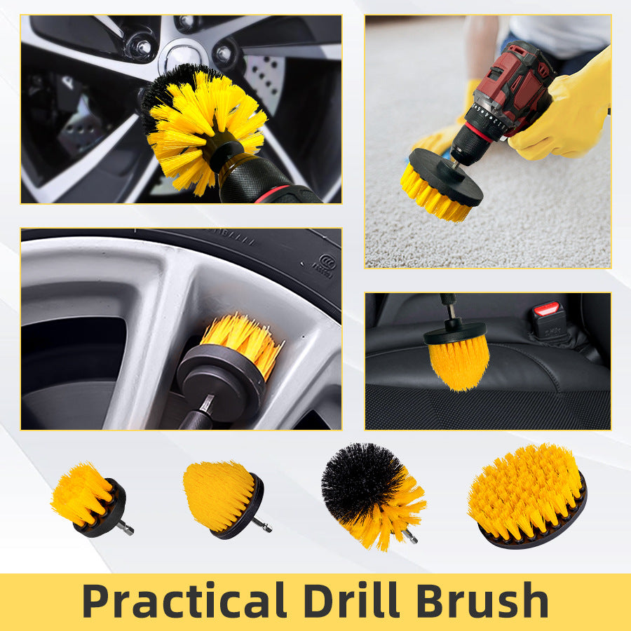 This car cleaning suit includes multiple brush sizes and shapes, allowing flexible use on wheels, tires, carpets, seats, dashboards, and trims. When attached to an electric drill, the drill brush provides powerful rotating action, saving time and effort compared to manual cleaning. The variety of attachments ensures precise cleaning for different surfaces without unnecessary wear.