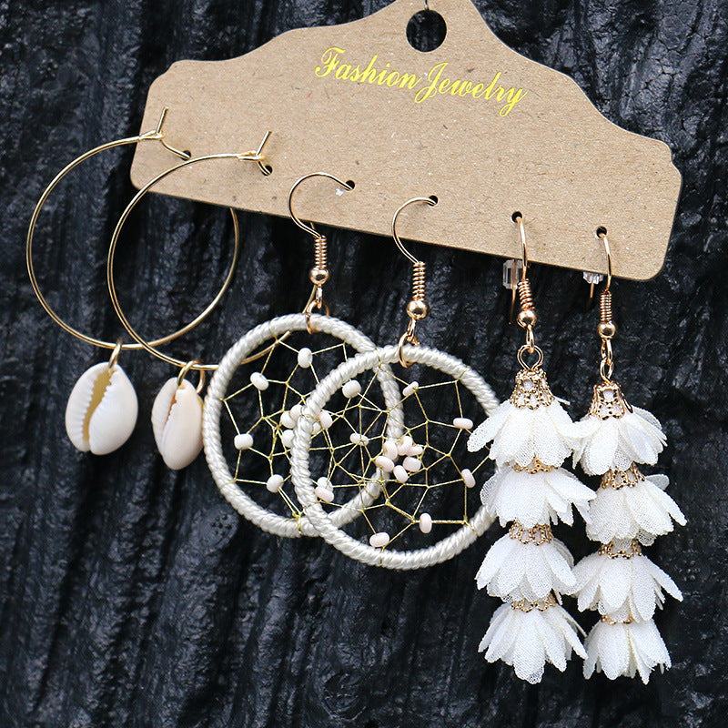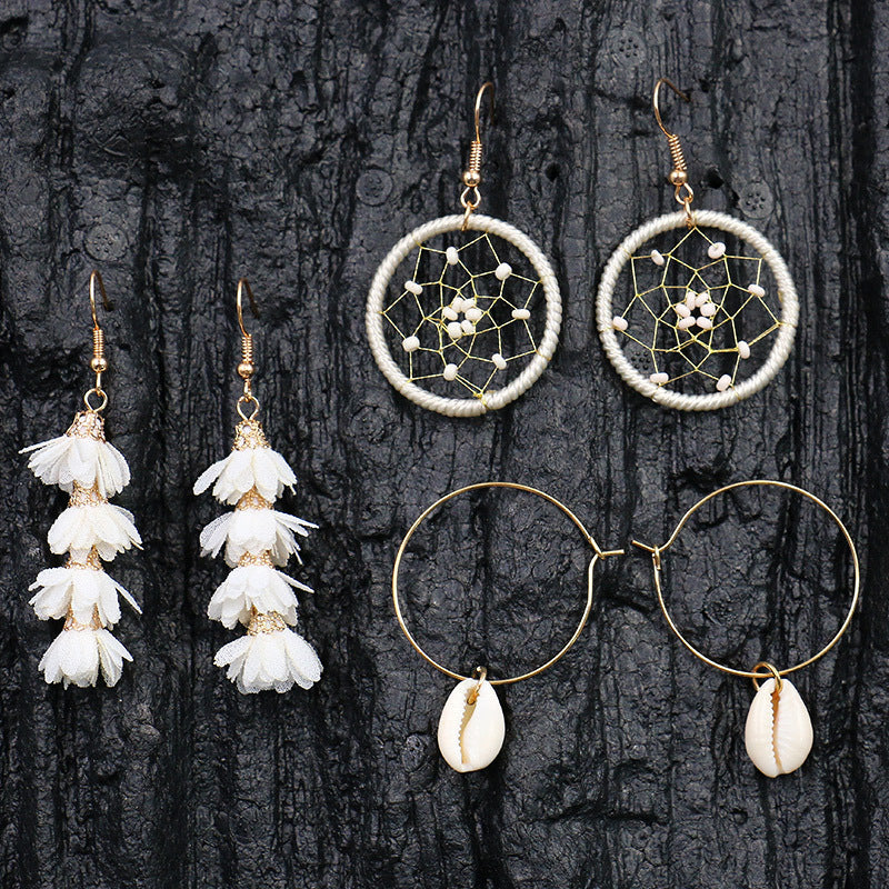 Includes 3 unique earring designs: golden shell, dream catcher & flower