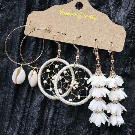 Add a touch of creative Korean fashion to your look with this stylish 3-piece earring set! Featuring a mix of golden shell, dream catcher, and flower designs, this set is perfect for expressing your unique personality with elegance and charm. š