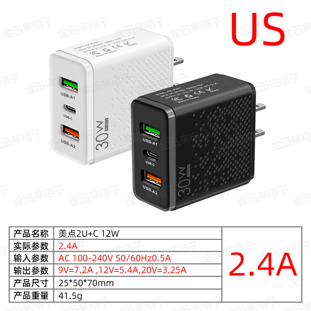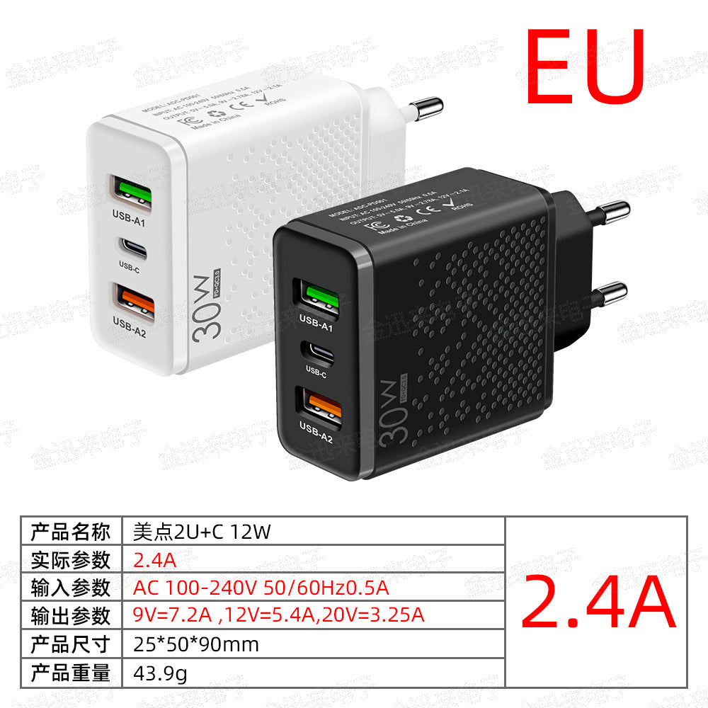 30W Fast Charger 5V2A Multi-Port 2U+1C Universal Plug