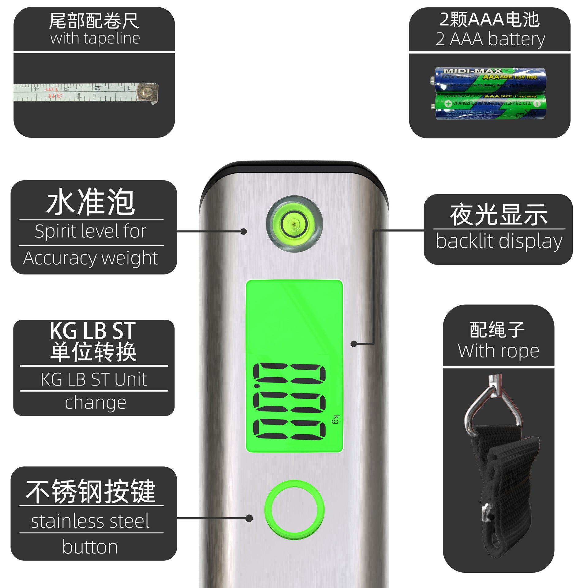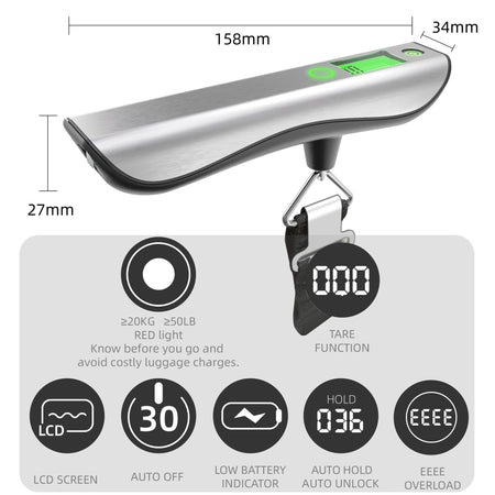 🪝 Hook-style design for luggage, parcels, and fish weighing