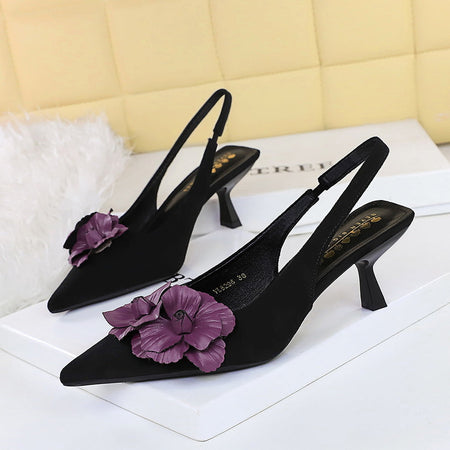 💖 Step into elegance with European and American Banquet Stiletto Shallow Mouth Back Hollow Shoes for Women, 2025 New Style! Designed with a contrasting color flower back strap, these high heels bring a feminine, sophisticated look perfect for banquets, parties, weddings, or evening outings.