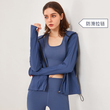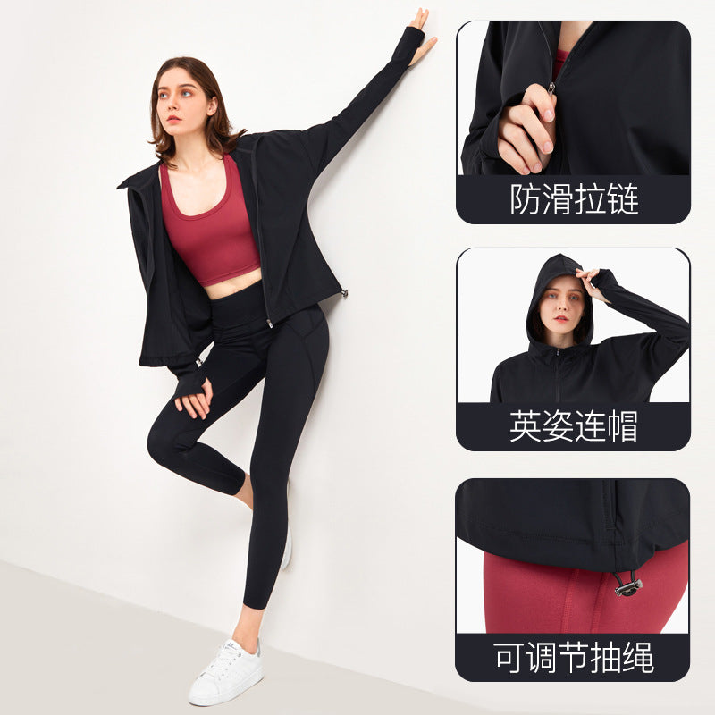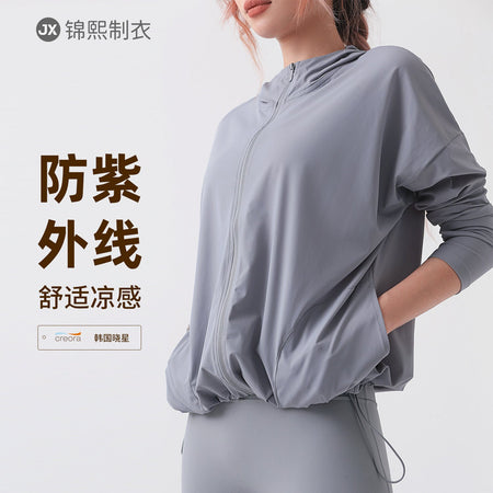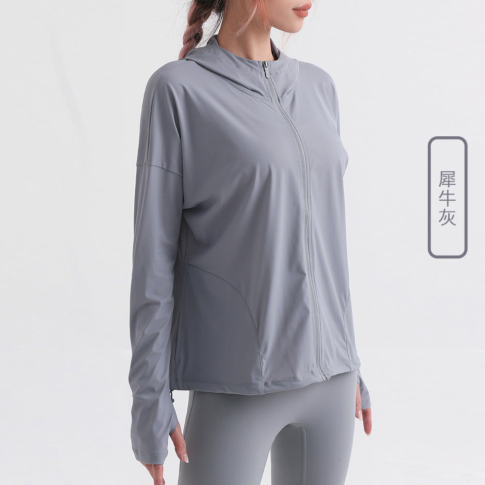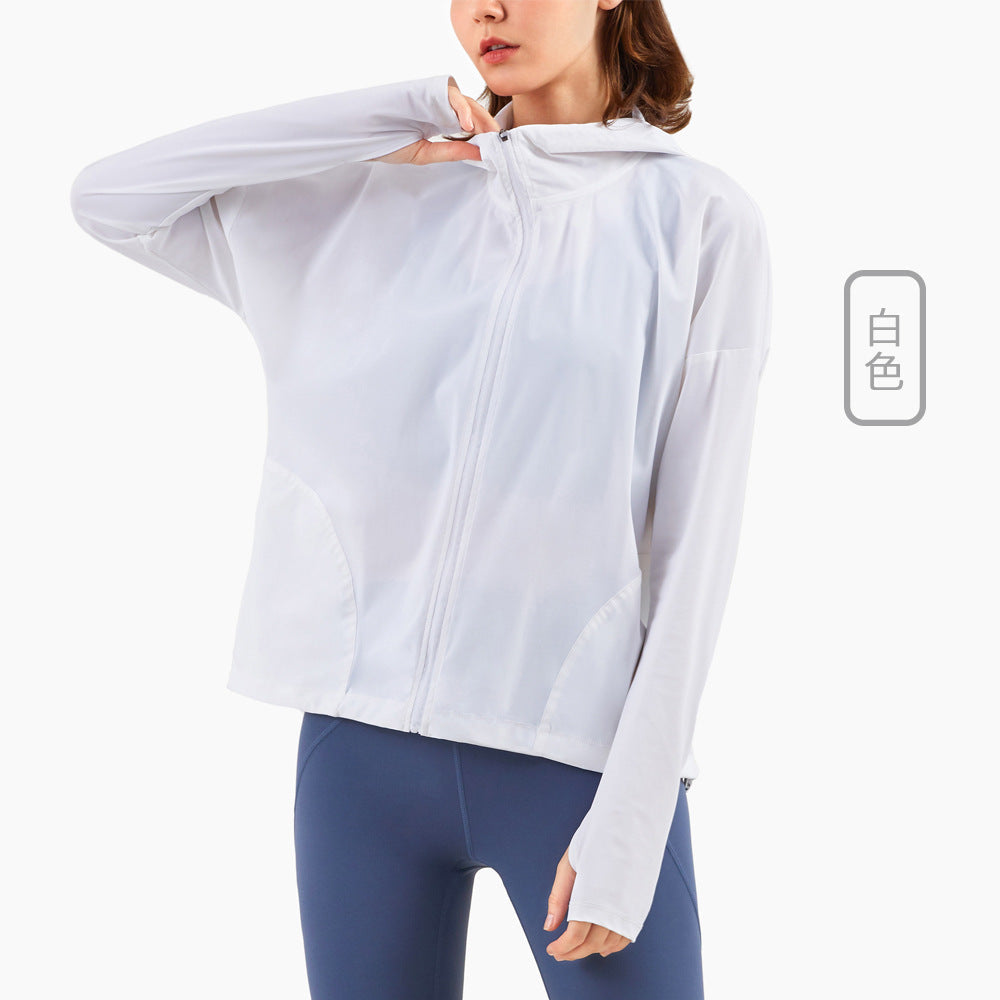 Crafted from breathable, sun-protective fabric, this jacket shields your skin from harmful UV rays while keeping you cool and dry. The full-zip front allows for easy on-and-off wear, while the hood adds extra protection from sun or wind. Its sleek design makes it versatile enough to pair with leggings, sports pants, or casual outfits. 🌸