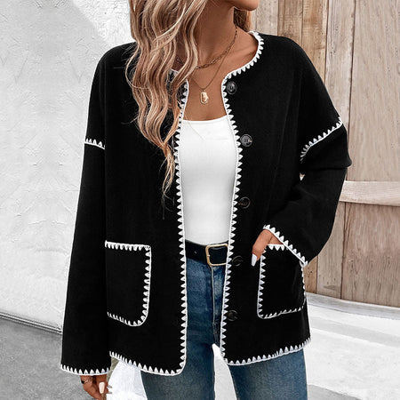 Made from premium polar fleece material, the jacket provides soft, plush warmth while remaining lightweight and breathable 🌿. Its loose and casual design ensures a relaxed fit, ideal for layering over sweaters, tops, or dresses 👗👖. The white trim detailing adds a modern and chic touch, enhancing the jacket’s elegant yet versatile look 🏙️.