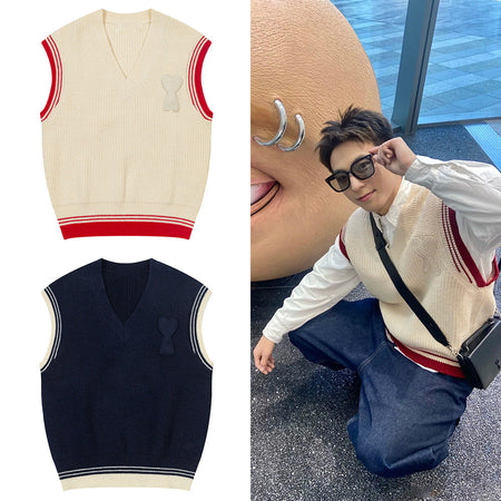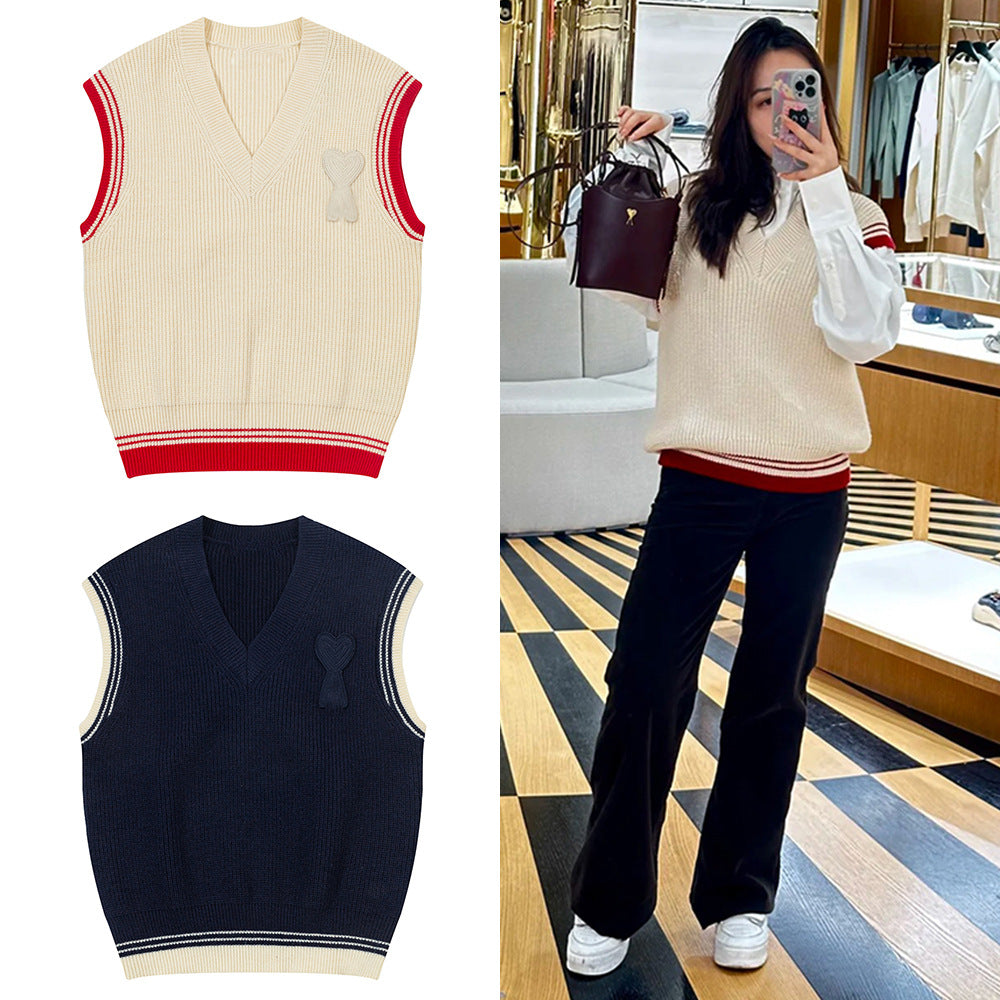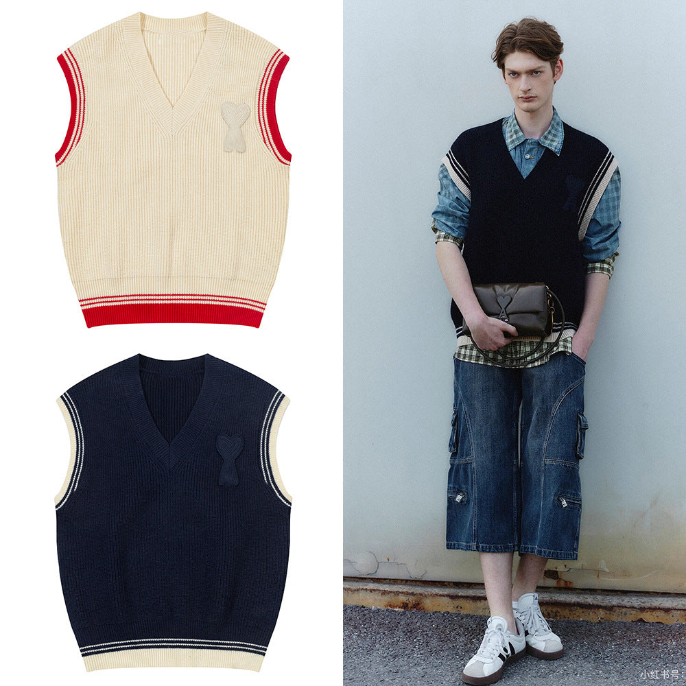 Make a statement with this color-blocked sleeveless sweater vest, designed with a woven heart-letter detail for a playful yet stylish touch. Perfect for men and women, this knit vest blends casual comfort with personality.