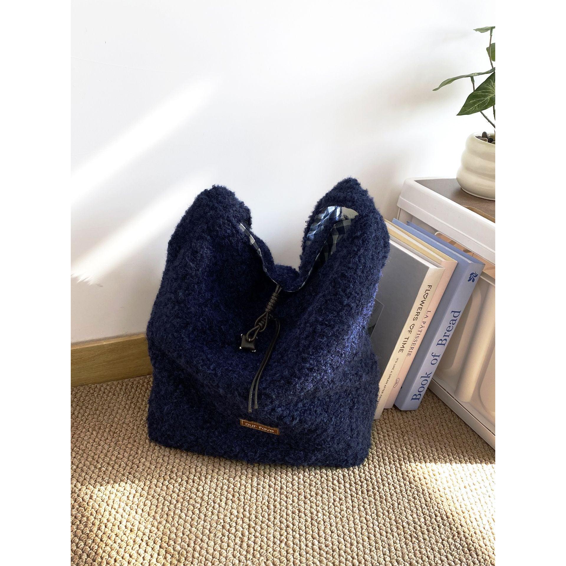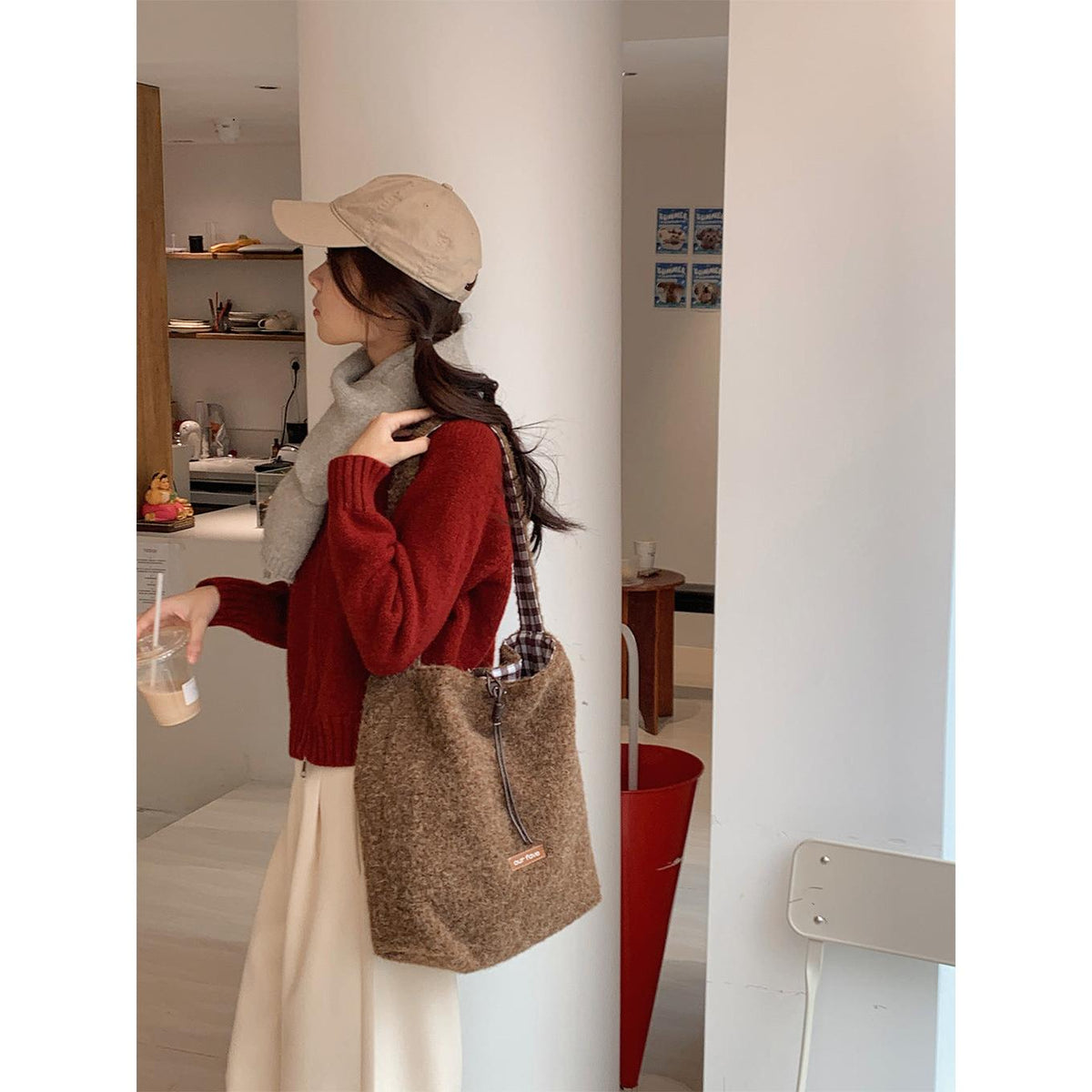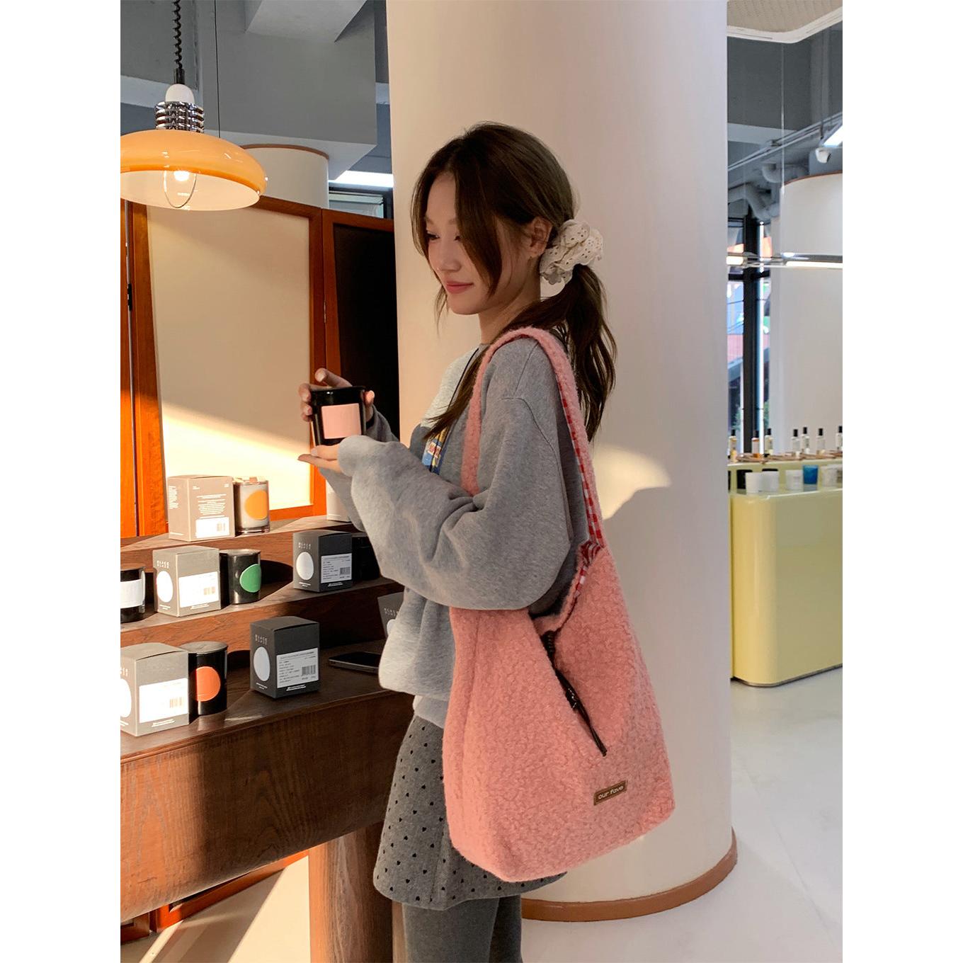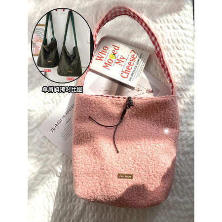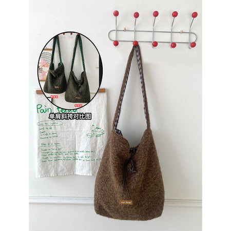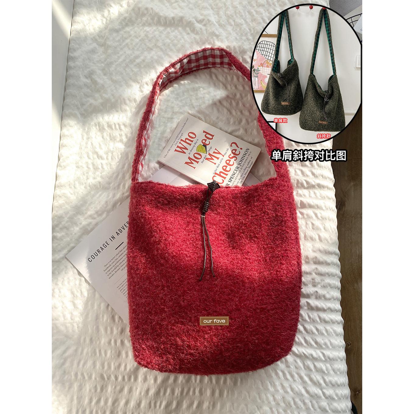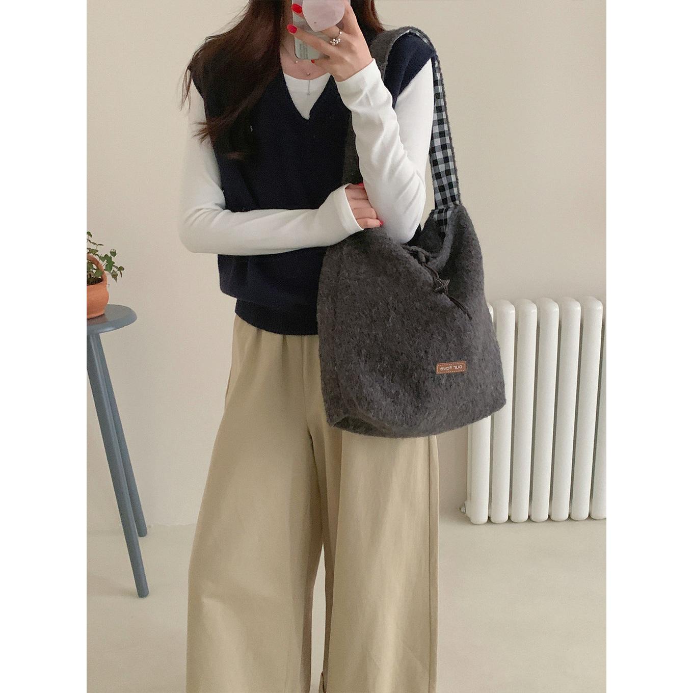 A fashionable bucket bag that combines warm texture, space, and versatility effortlessly 💖