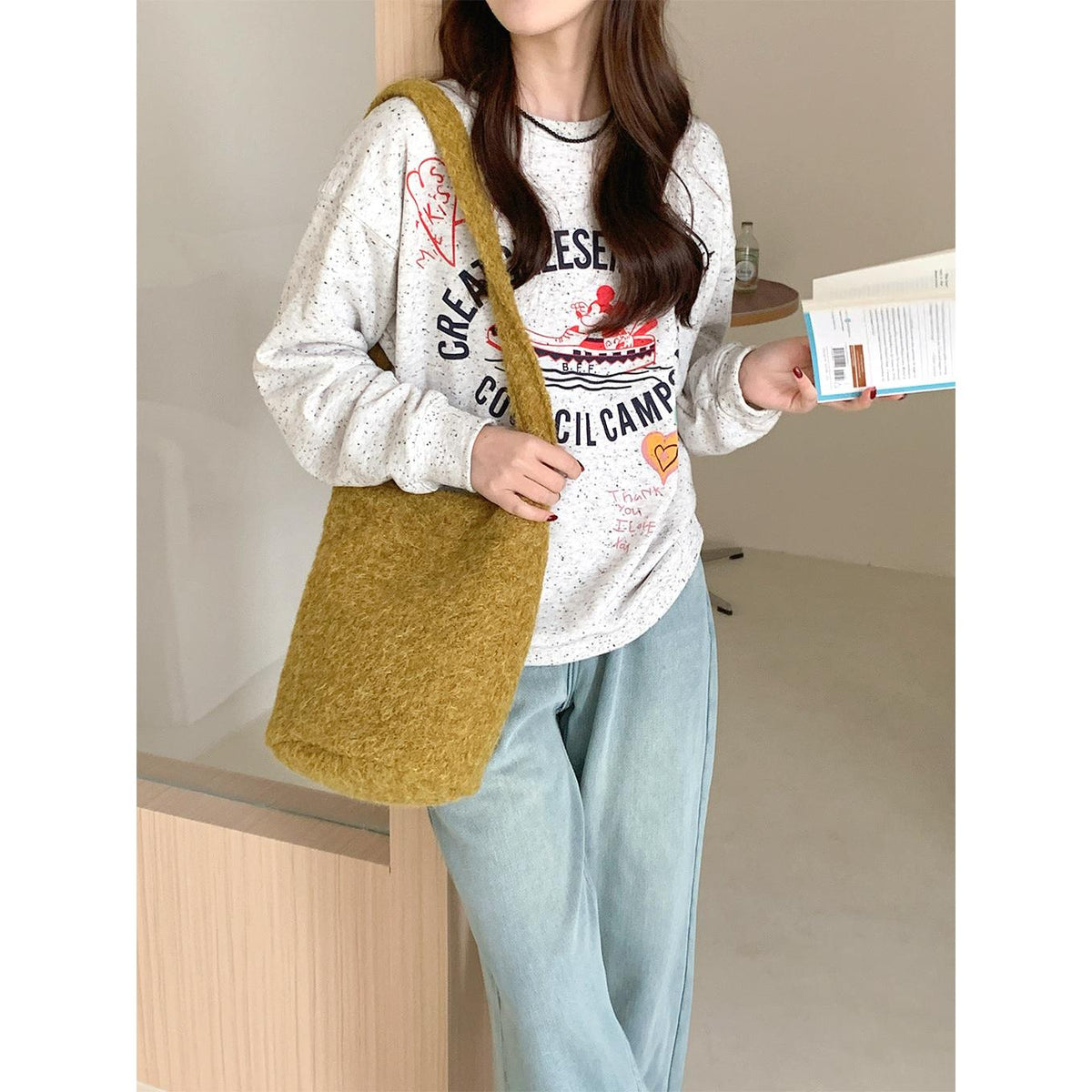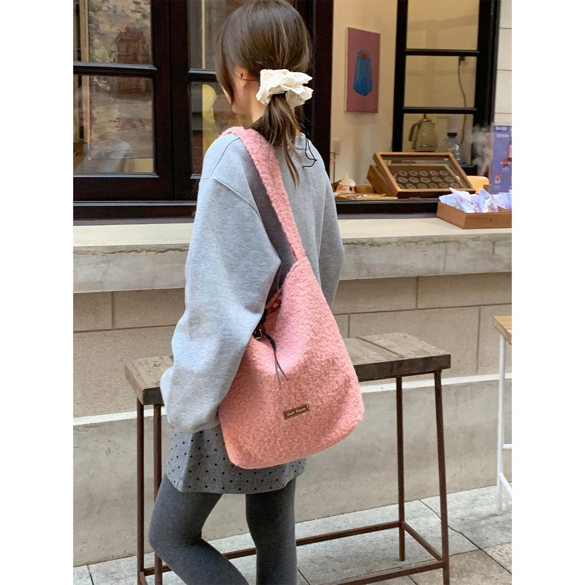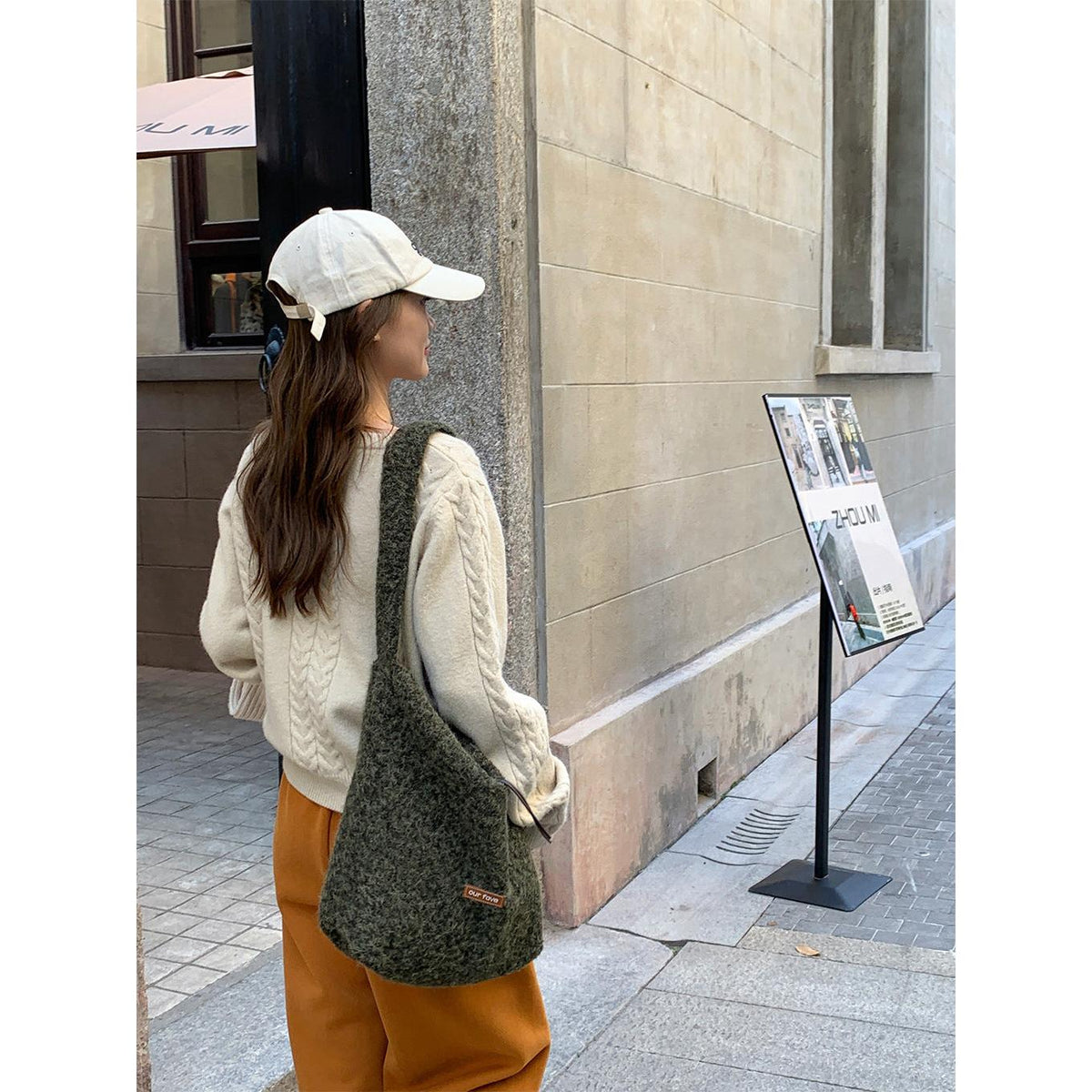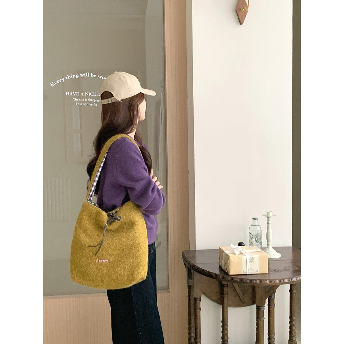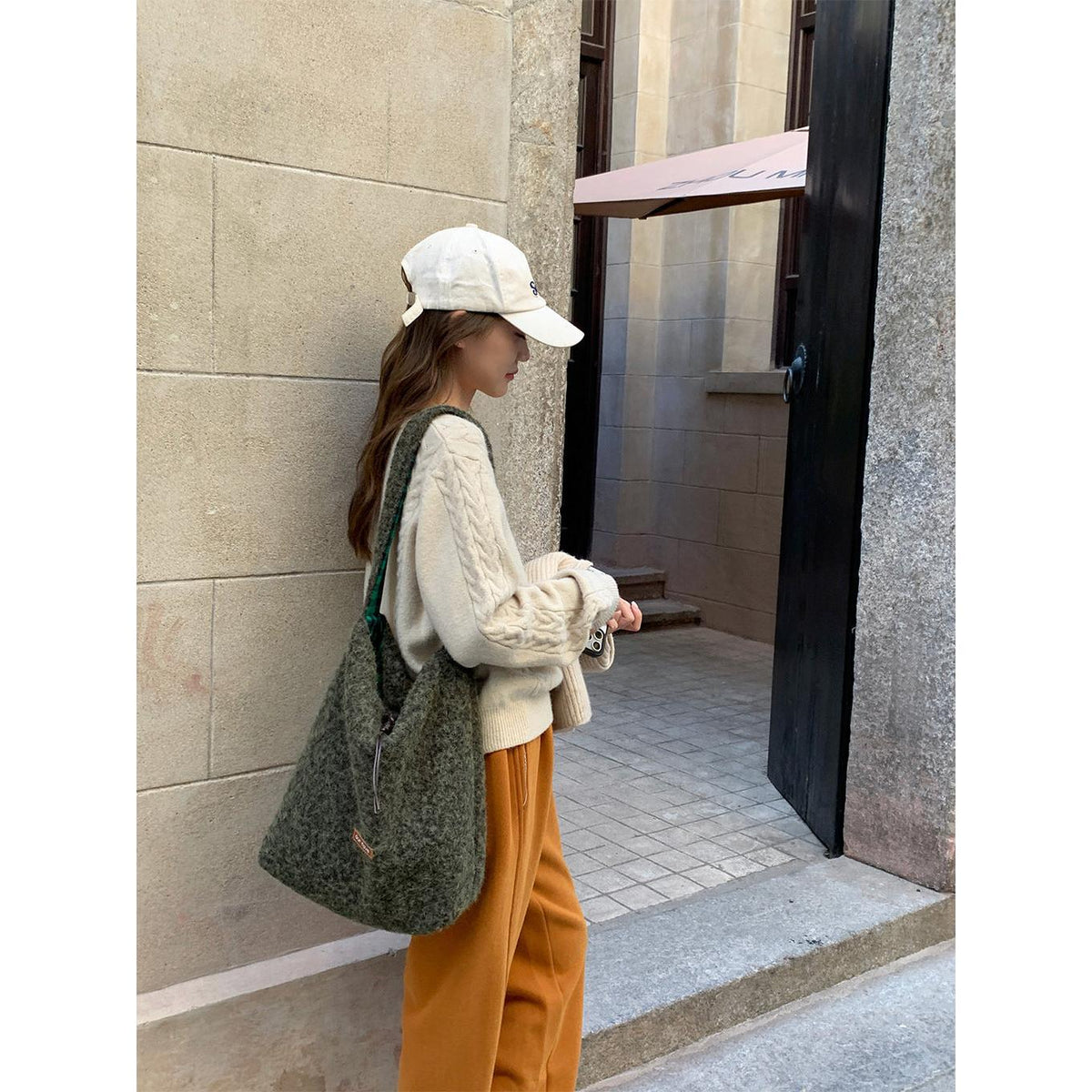 A fashionable bucket bag that combines warm texture, space, and versatility effortlessly 💖