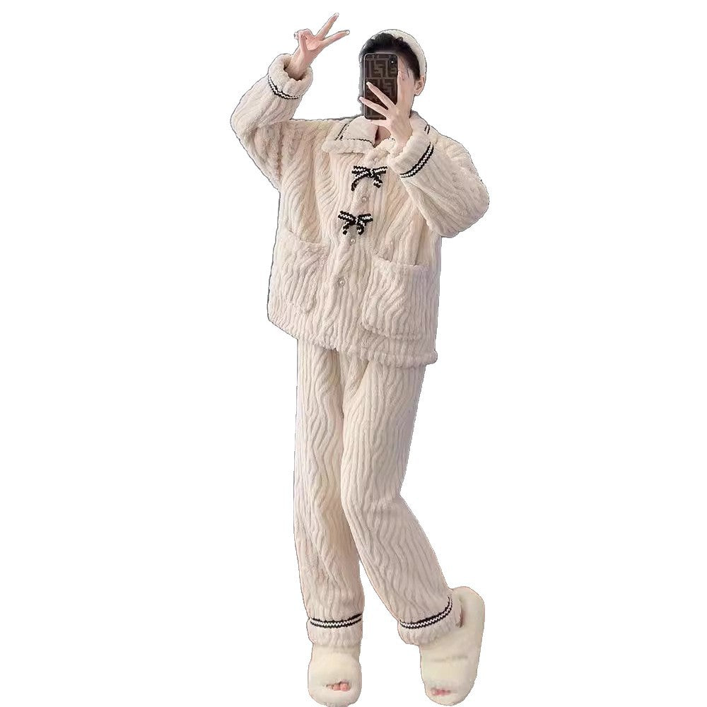 Featuring a sweet bow detail on the cardigan and a matching flannel suit, it adds a playful yet elegant touch to your loungewear. The thickened material keeps you warm and snug, ideal for sleeping, relaxing, or cozy indoor activities.