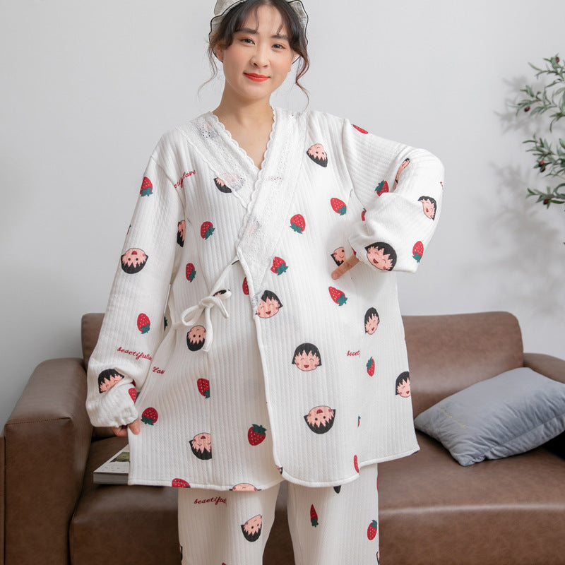 Designed for maximum comfort, these Plus Size Cotton-Padded Maternity Pajamas are the perfect choice for autumn and winter. With a kimono lace-up design and extra-roomy cut, they provide warmth and flexibility for pregnancy and postpartum care.
