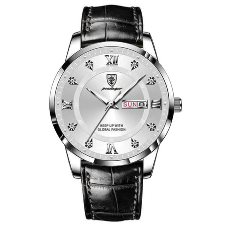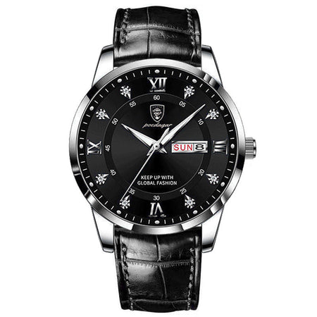 Designed for the modern gentleman, this watch features a sleek ultra-thin case, combining minimalist aesthetics with maximum comfort. The double calendar display keeps your day and date clearly visible, while the luminous hands ensure you can check the time even in the dark 🌙✨