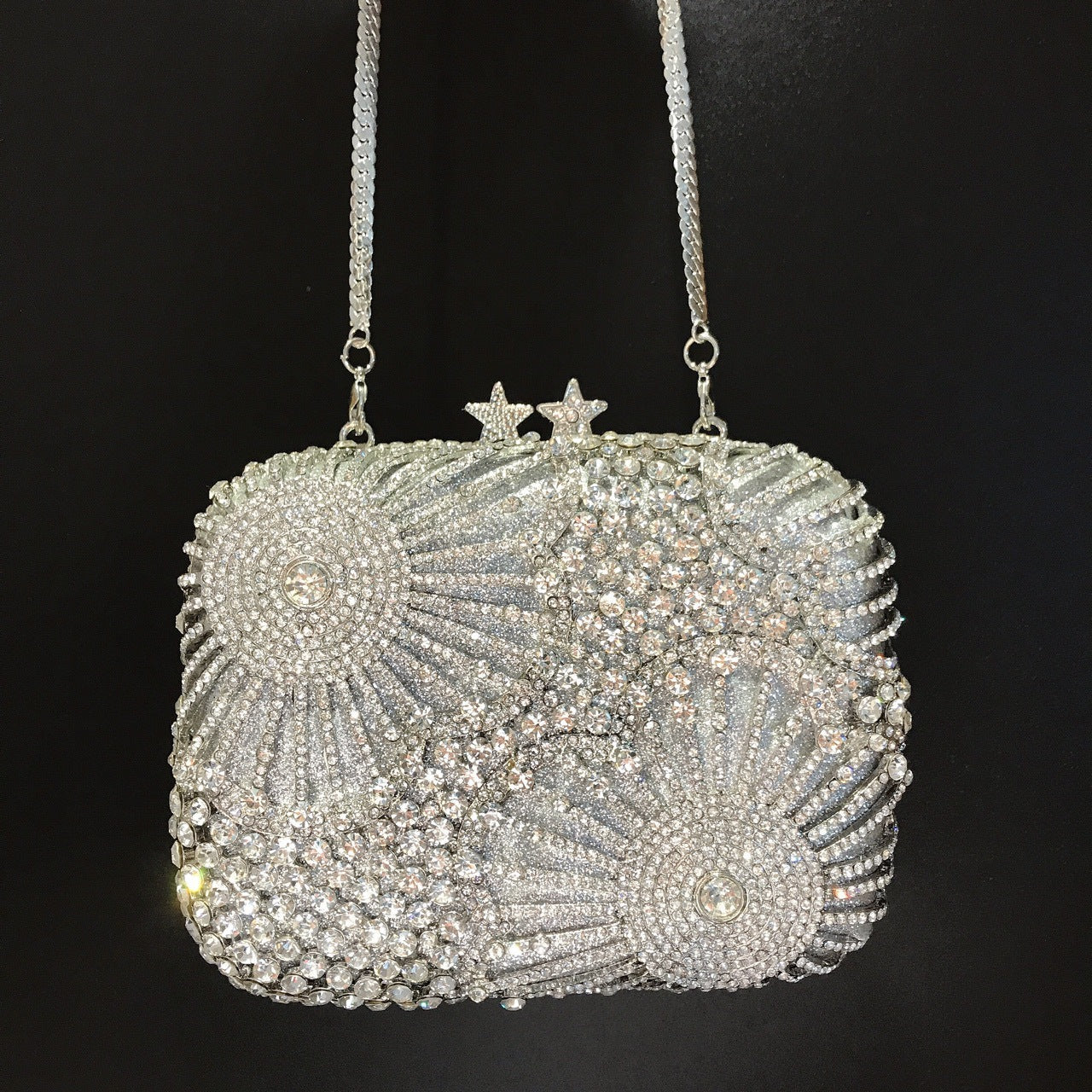 🌠 Set off fireworks at any event with this silver crystal clutch—it’s a stunner!