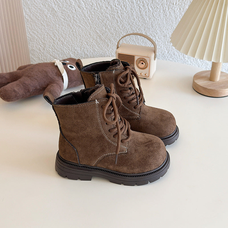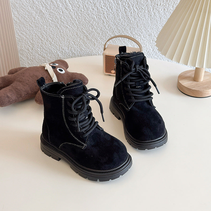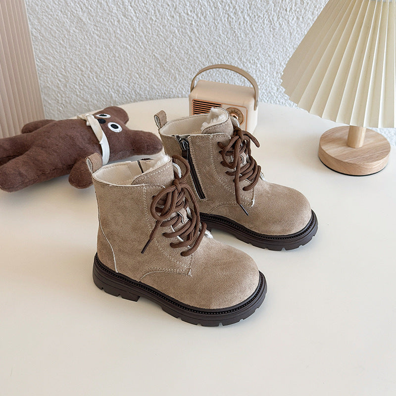 Keep kids warm and stylish with these mid-calf fleece-lined leather boots, designed for comfort and safety 👢❄️