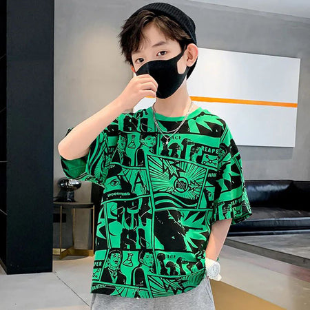 The cartoon anime print adds an energetic and trendy touch, appealing to boys who like playful and sporty designs. This T-shirt is suitable for daily wear, playground time, casual outings, tuition classes, and summer sports activities ⚽🎒. Its round neck and short sleeves make it easy to wear and pair with shorts, jeans, joggers, or track pants.