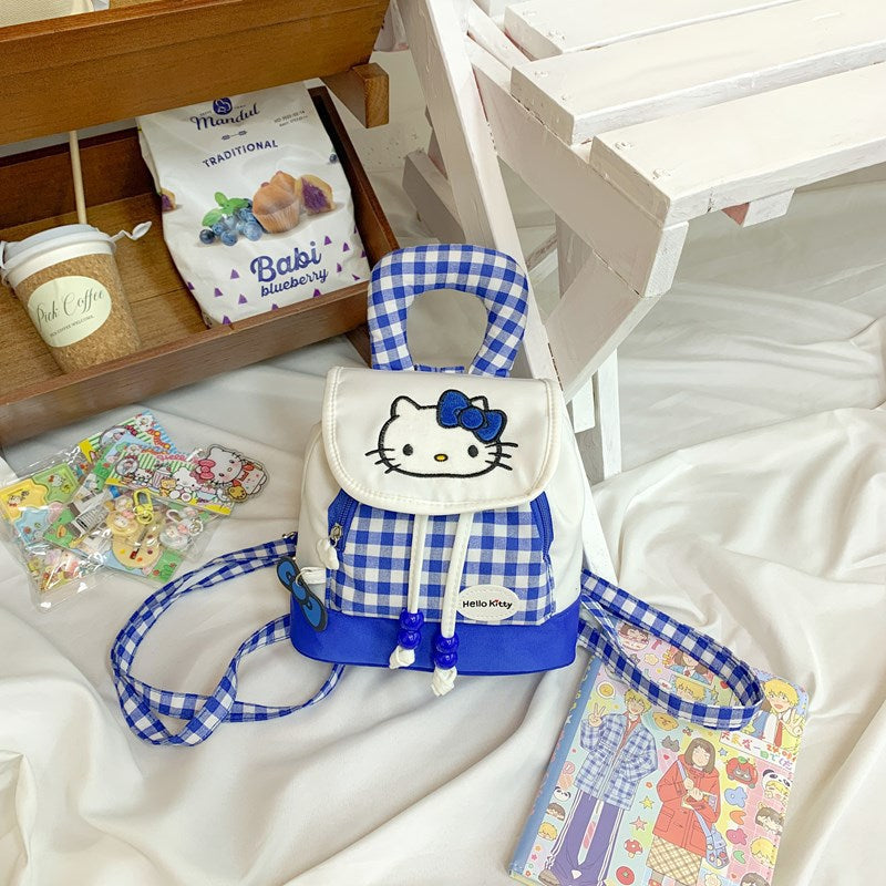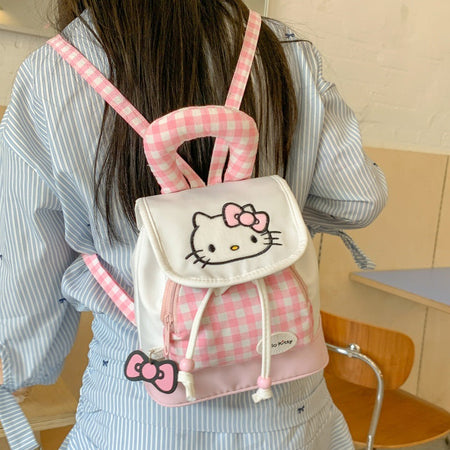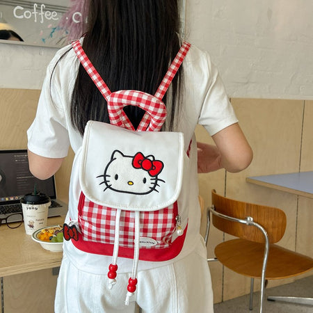 Cartoon Kitty Mini Backpack | Cute Red Plaid Girls Bag