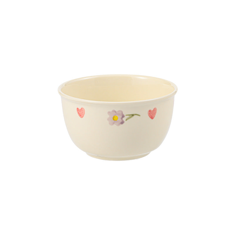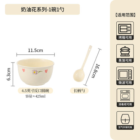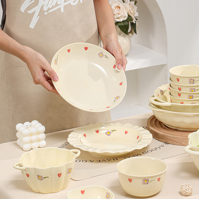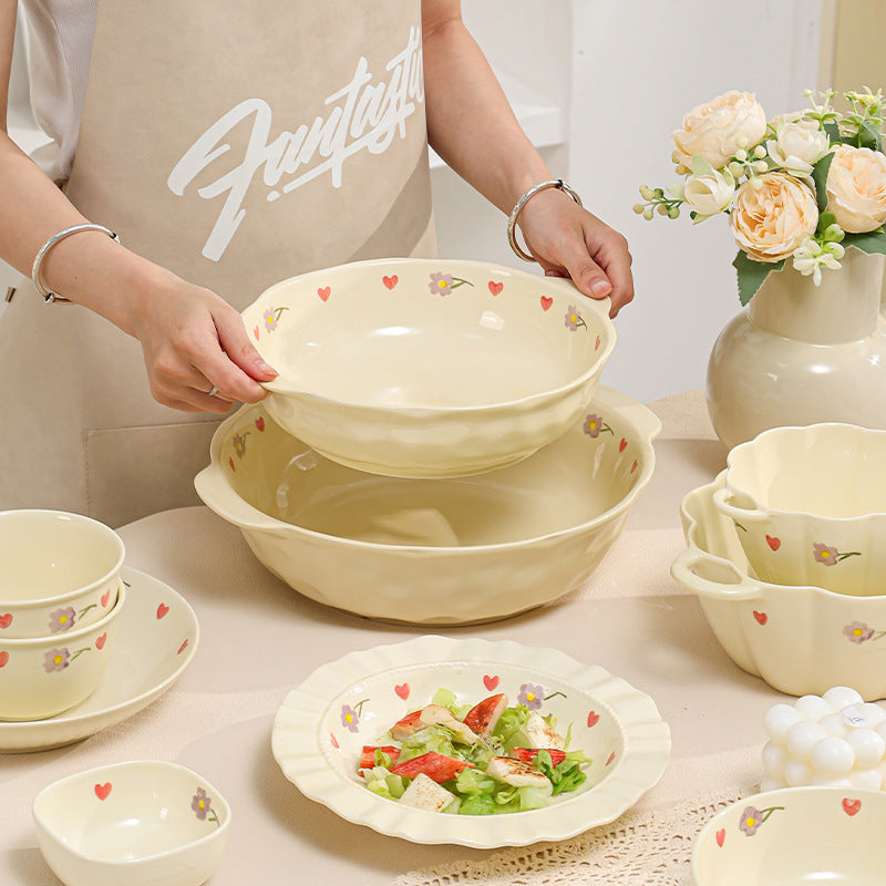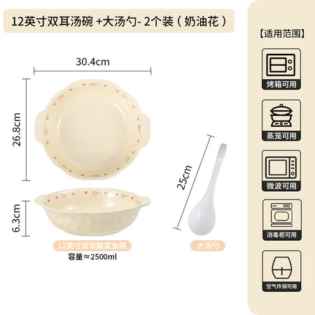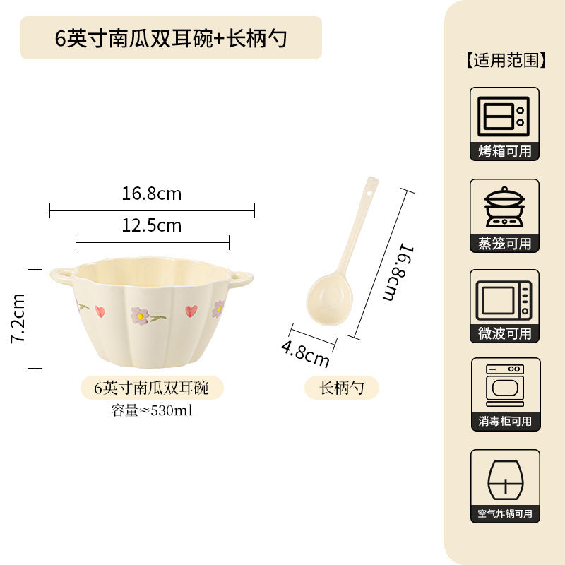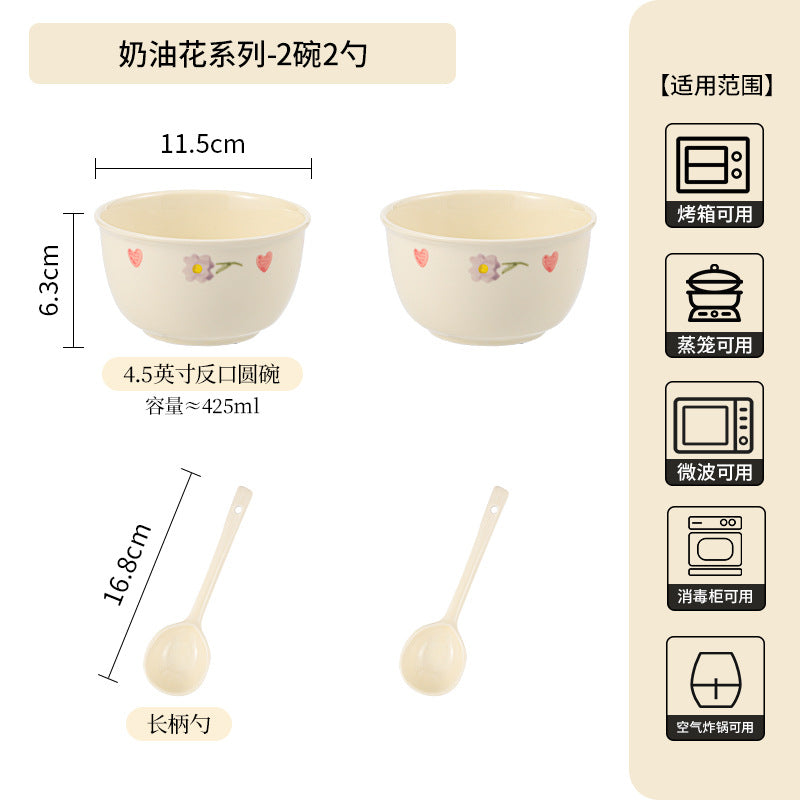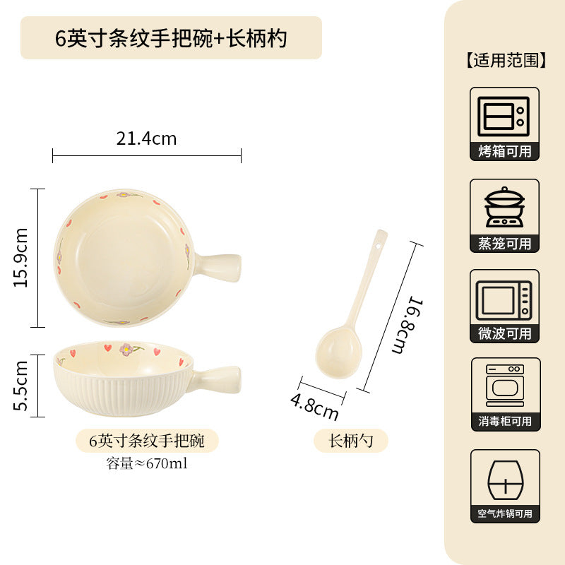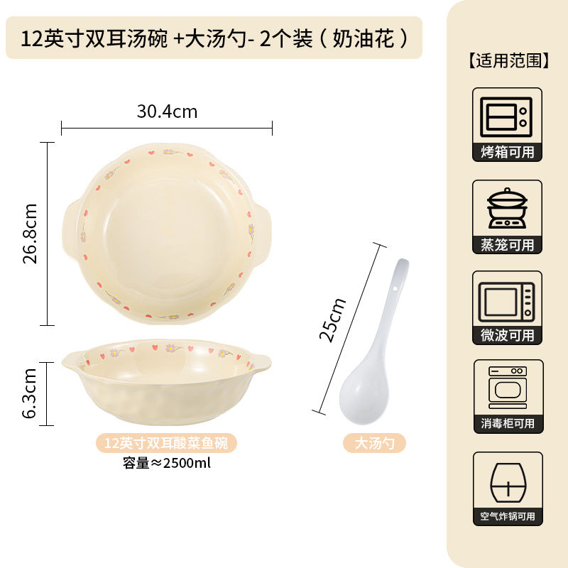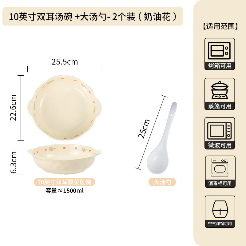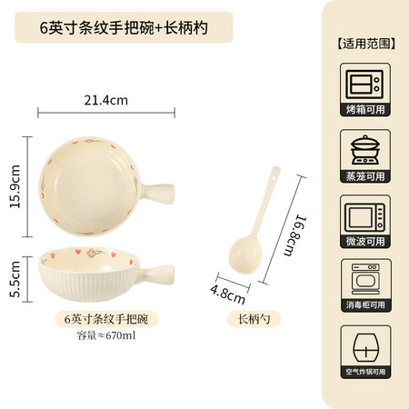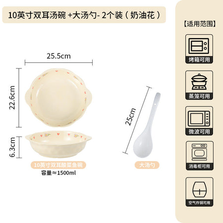 Cream Ceramic Bowl Set Rice Soup Double-Handle Tableware