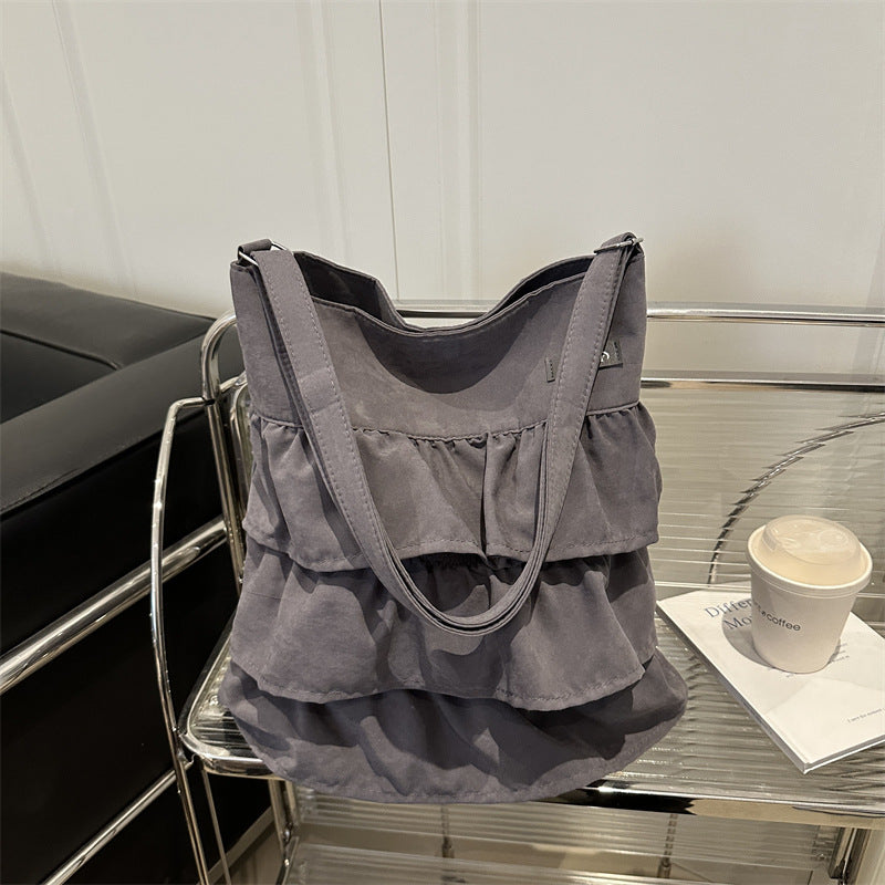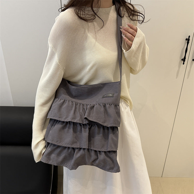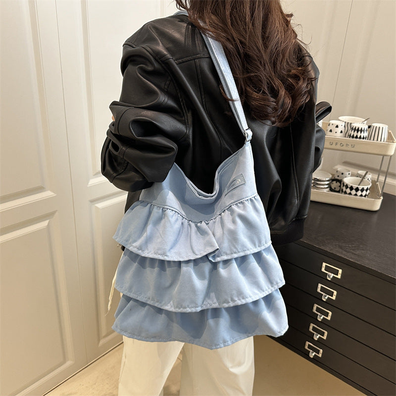 Add a soft, feminine touch to your outfit with this ruffled bucket-style crossbody bag. Featuring a niche fashion design and flowing ruffle details, it creates a playful yet elegant look perfect for daily wear or special outings. ๐