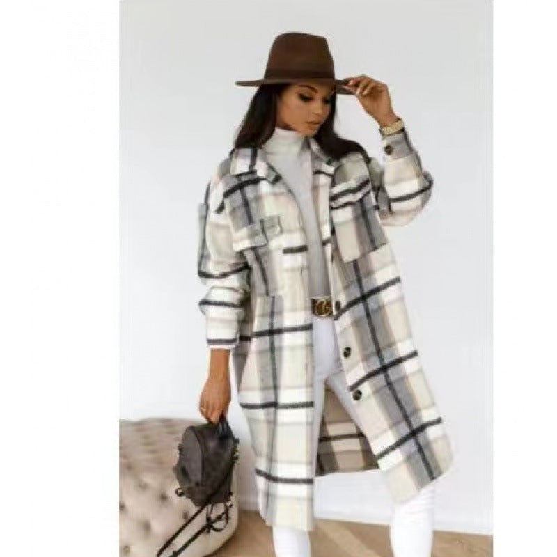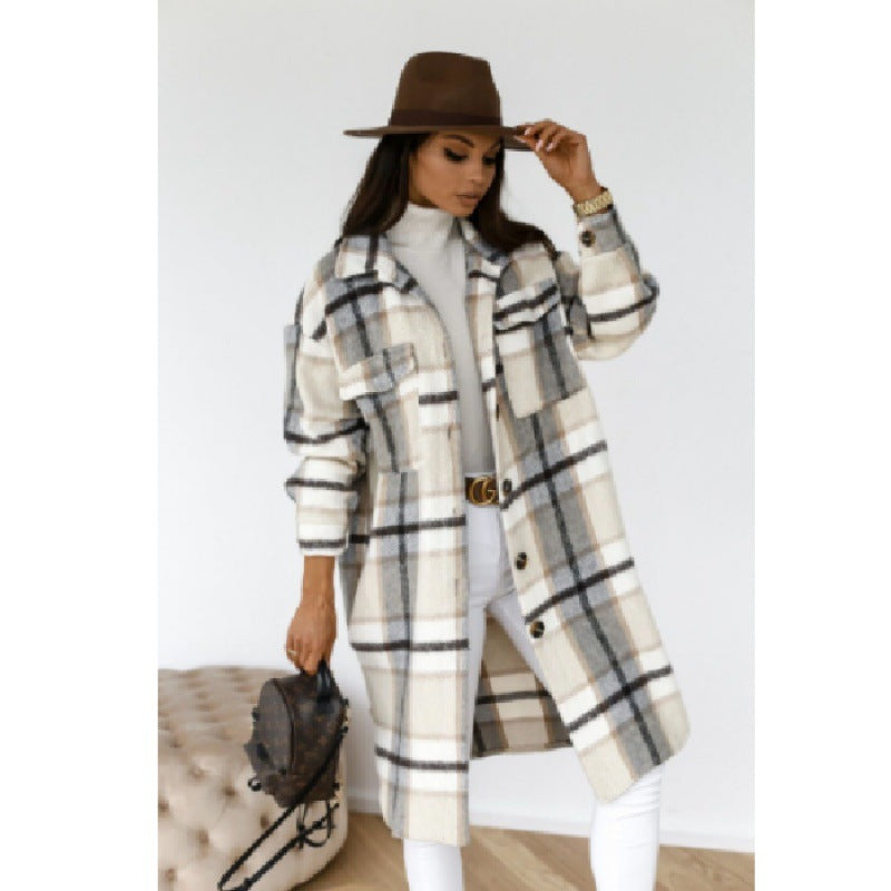 Perfect for autumn and winter, this long-sleeve coat features a timeless plaid print and a mid-to-long length, combining warmth with fashionable elegance. Ideal for casual outings, office wear, or weekend events.