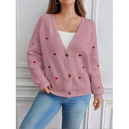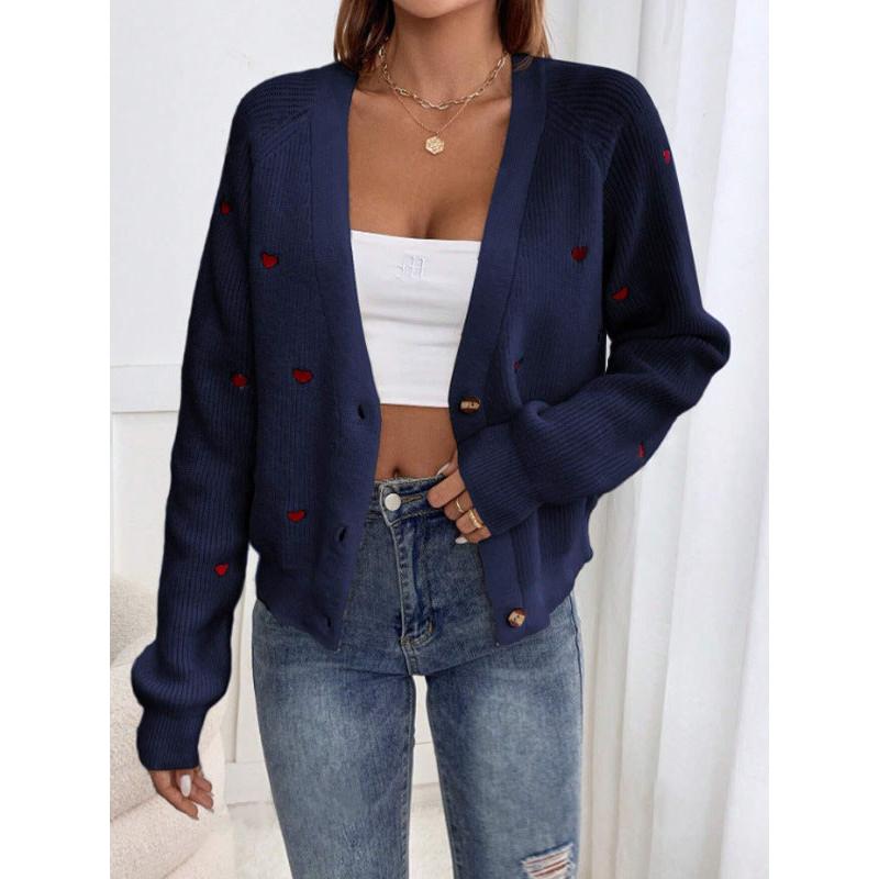 Add a touch of romance to your wardrobe with this European & American-style Love Embroidered Cardigan Sweater ๐งถ๐. Perfect for autumn and winter, this V-neck, single-breasted knit jacket features sweet embroidered heart details that make your outfit pop with personality and warmth.