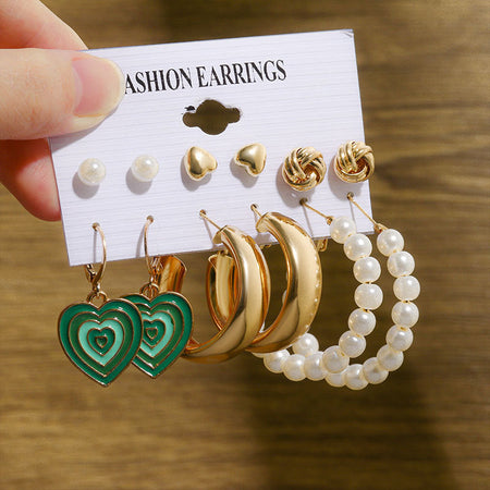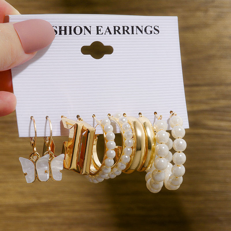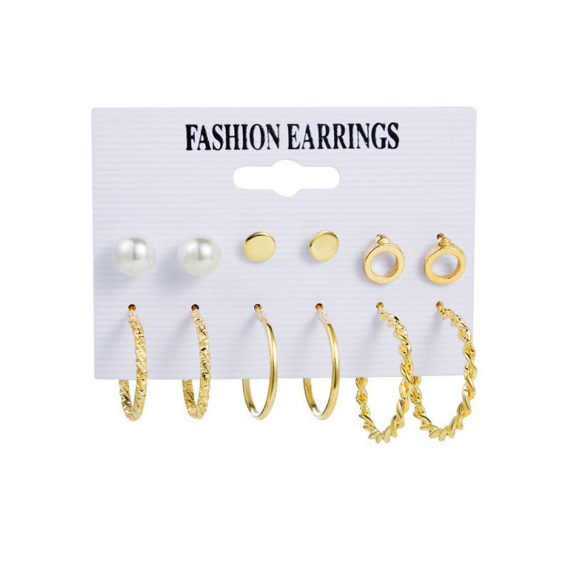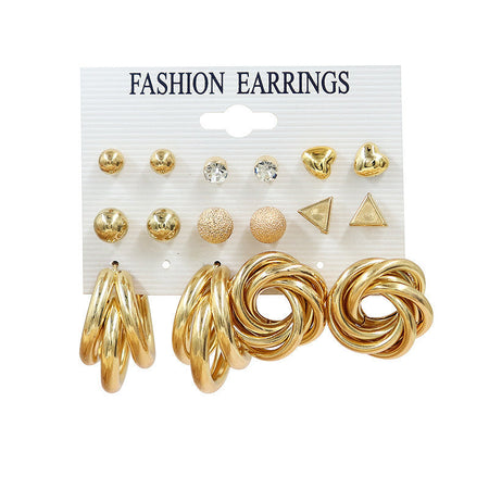 Retro Gold Earrings Set | Geometric Pearl & Diamond Style