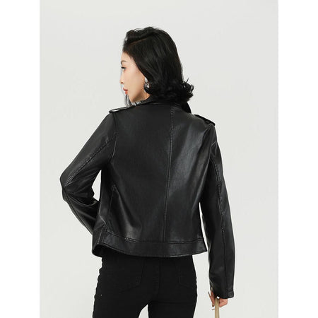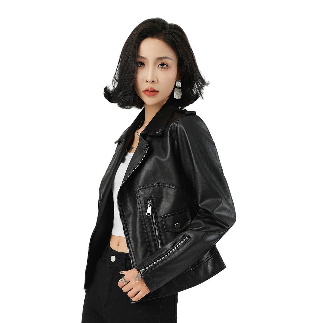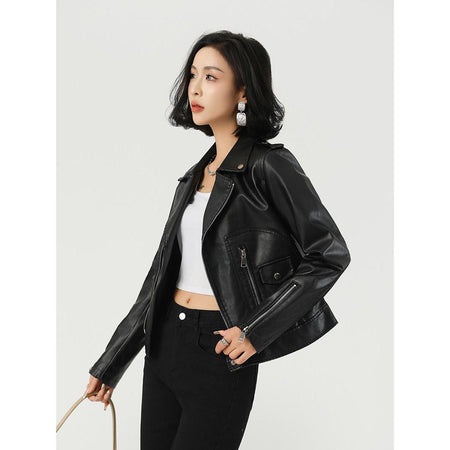 Women’s Short PU Leather Lapel Motorcycle Jacket