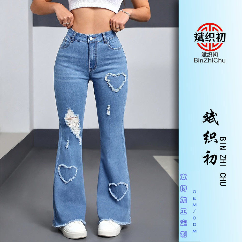 Make a bold fashion statement with the Cross-Border Women’s Stretch Heart-Shaped Pattern Ripped Flared Jeans 💖. Featuring cute heart-shaped accents and stylish ripped details, these jeans combine playful charm with modern street style. The flared cut and stretchy fabric provide comfort while creating a flattering silhouette for everyday wear. Perfect for casual outings, dates, or hanging out with friends.
