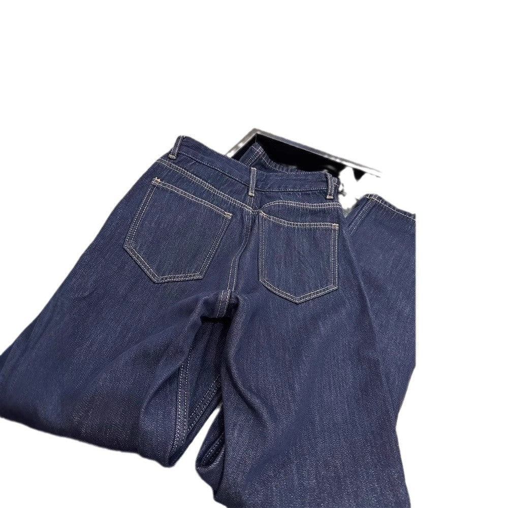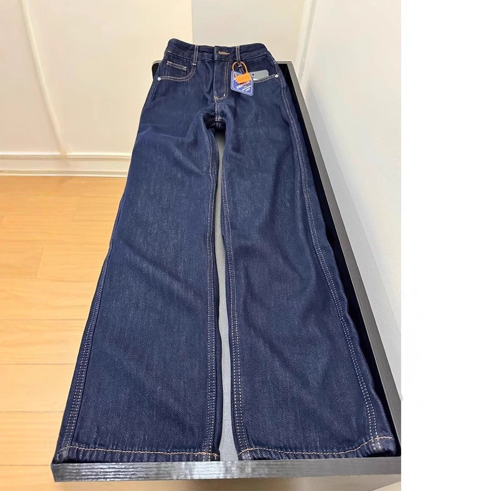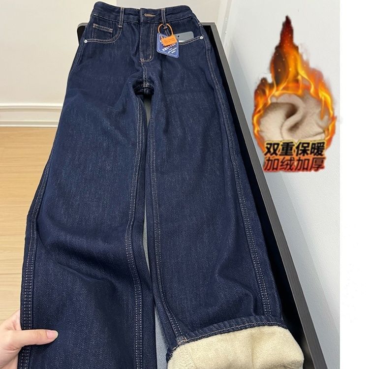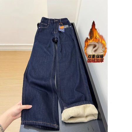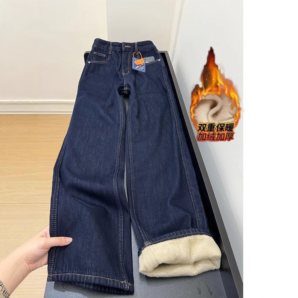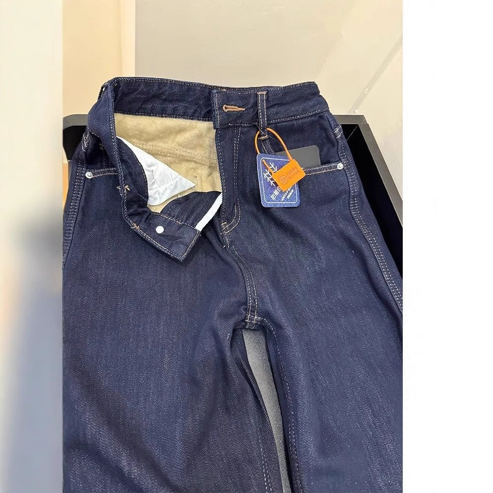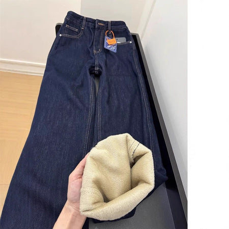 Featuring a slimming straight-leg cut with a loose wide-leg fit, these jeans combine comfort with a flattering silhouette, making them ideal for casual wear, outdoor activities, or semi-formal occasions. The dark blue color is versatile and easy to pair with sweaters, coats, and boots for a chic winter look.