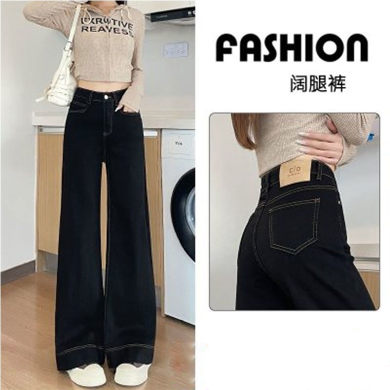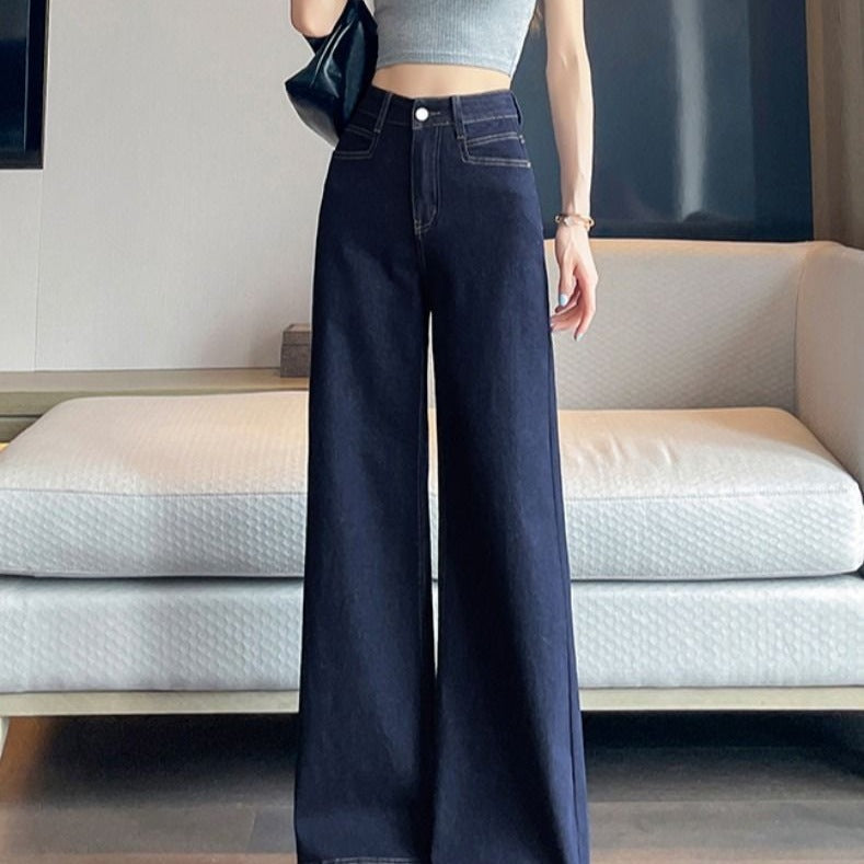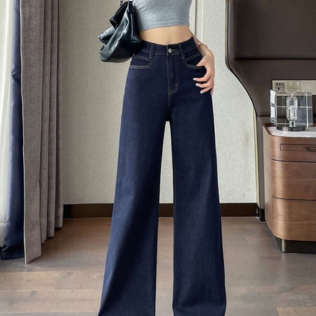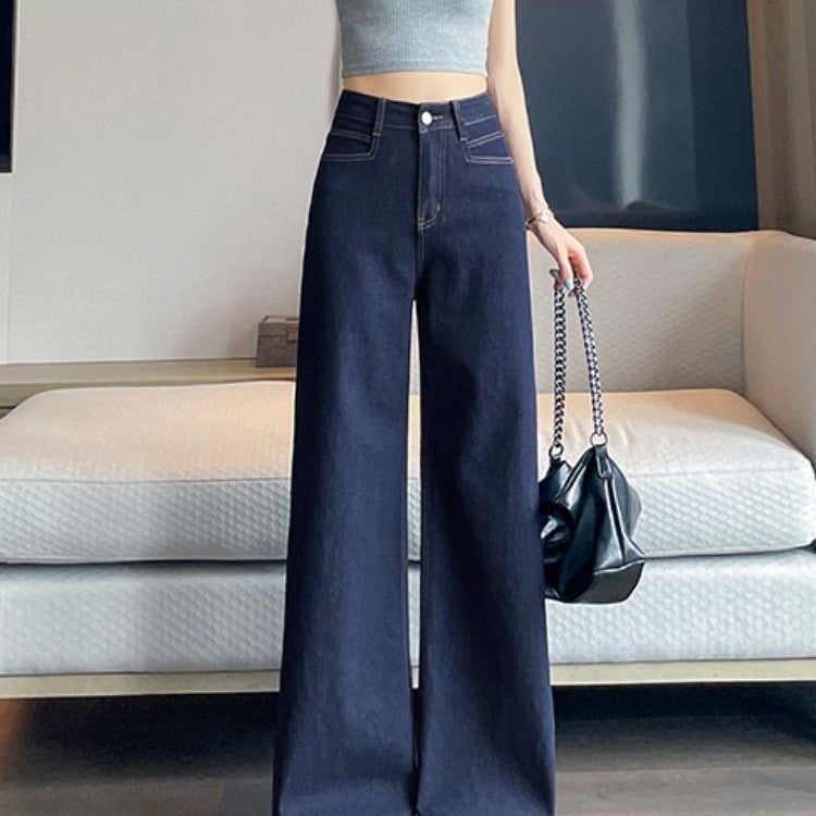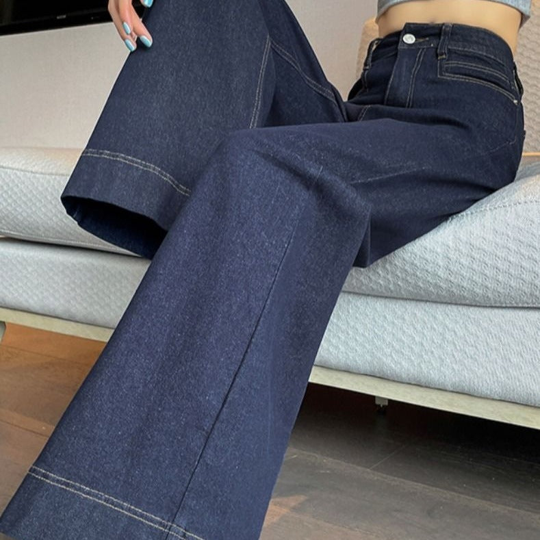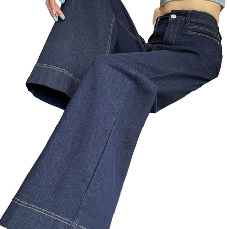 The wide-leg yet slim-straight design ensures a modern retro look that works well for casual wear, street-style outfits, or semi-formal occasions. The dark blue denim is timeless and versatile, making it easy to pair with sweaters, coats, and boots for a complete seasonal outfit.
