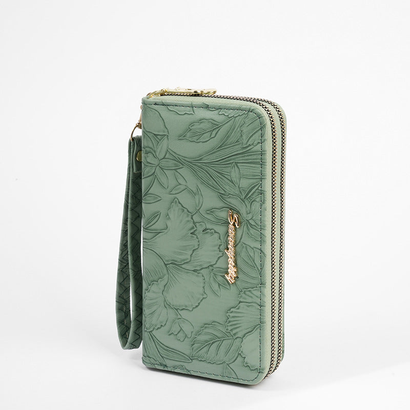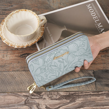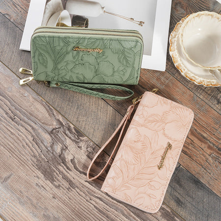 Featuring elegant embossing and two zippered layers, it offers room for coins, cash, cards, and your phone. Whether for formal events or daily chic, this walletβs refined design has you covered.