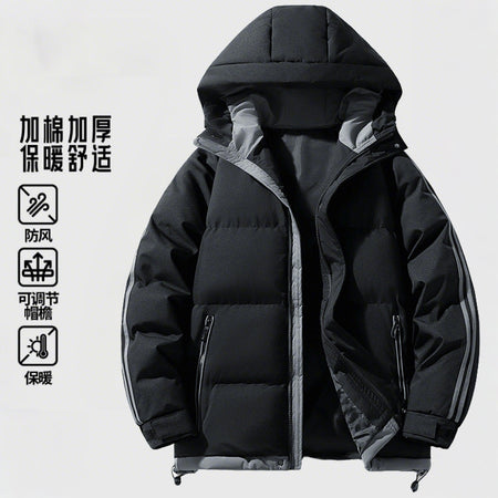 Experience warmth and style with this down cotton jacket for men, designed in Hong Kong style. The loose hooded puffer design ensures comfort and trendy appeal for winter couples’ outfits.