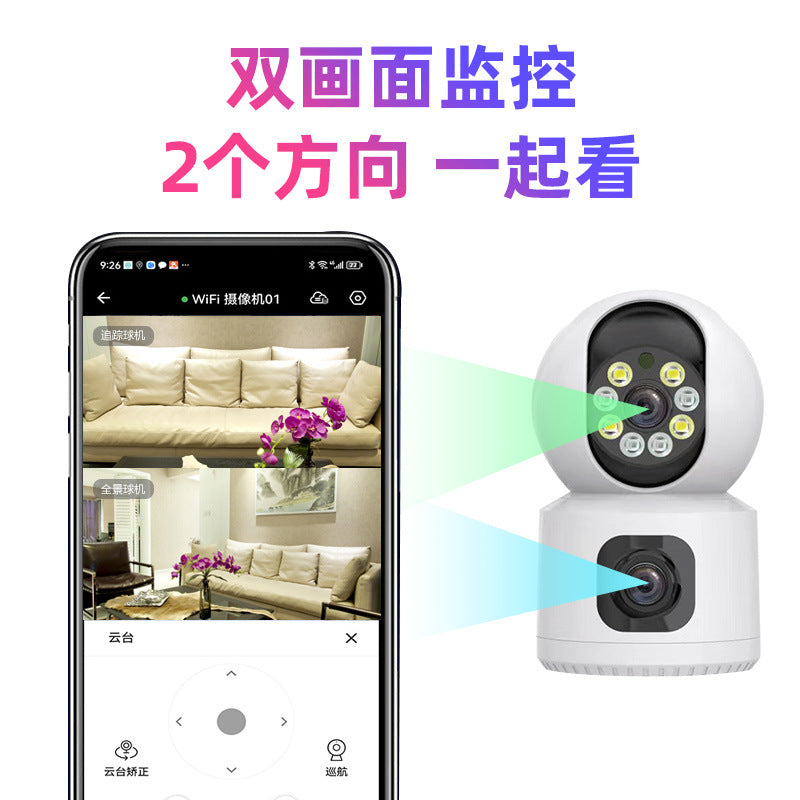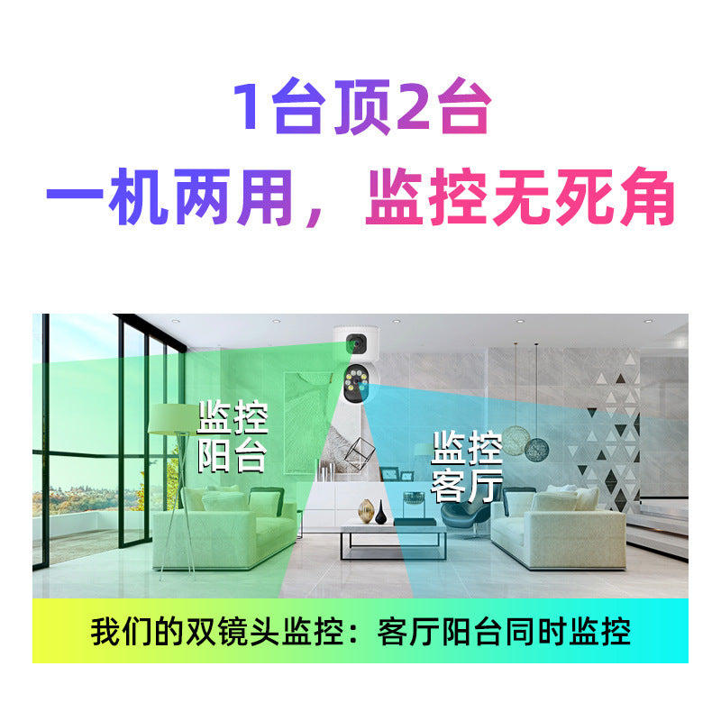 This dual-lens indoor camera offers full panoramic coverage, dual-screen viewing, and mobile remote control — making indoor monitoring effortless, smart, and dependable.