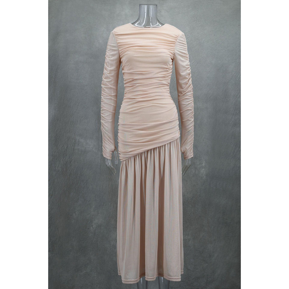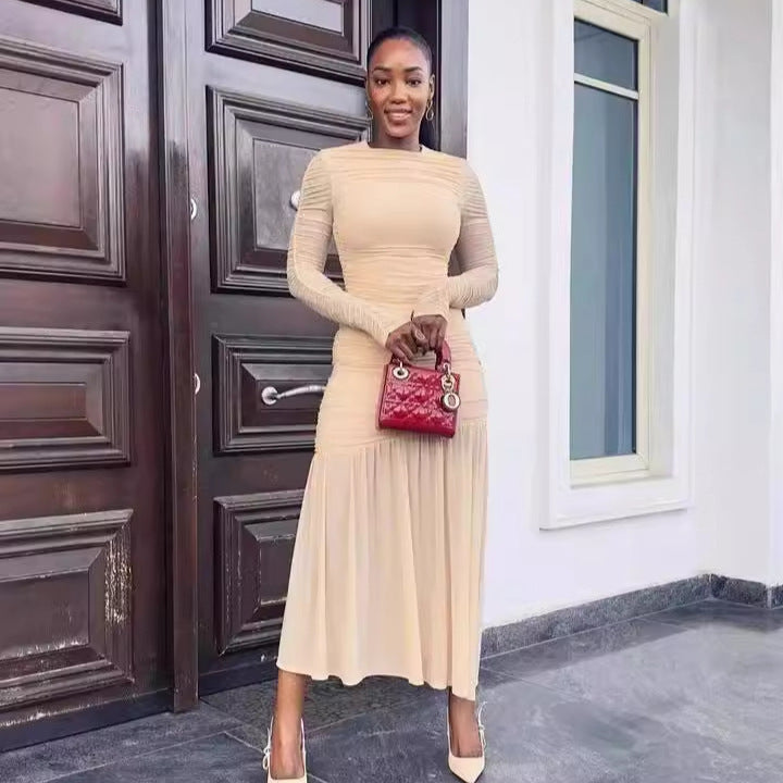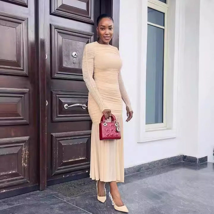 Elegant Slim Pleated Long Dress β Round Neck Style