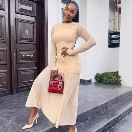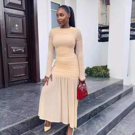 Turn every step into a statement with this Elegant Long Sleeve Pleated Dress π«. Featuring a classic round neck, slim-fit silhouette, and soft pleated design, this pure color dress is perfect for women who love timeless style with a sexy, modern twist.