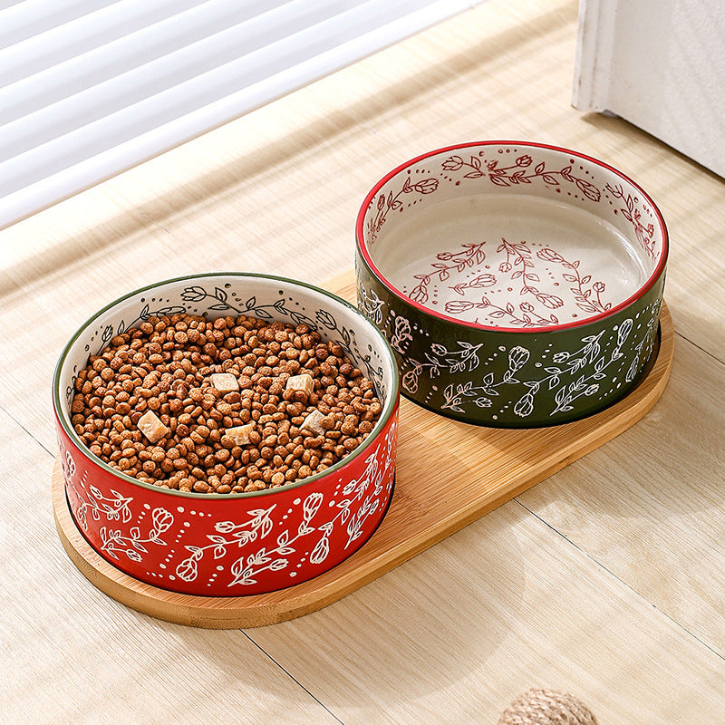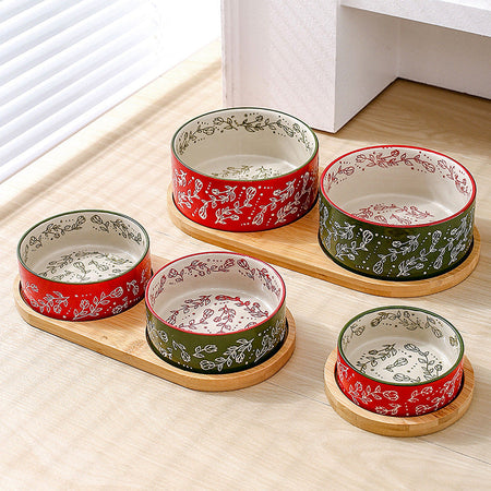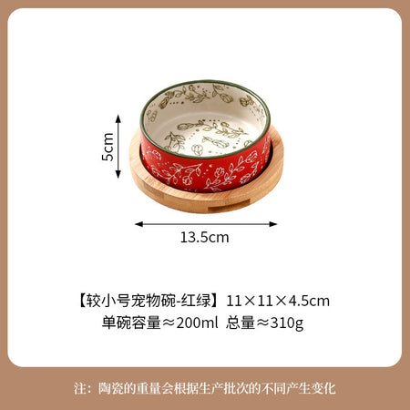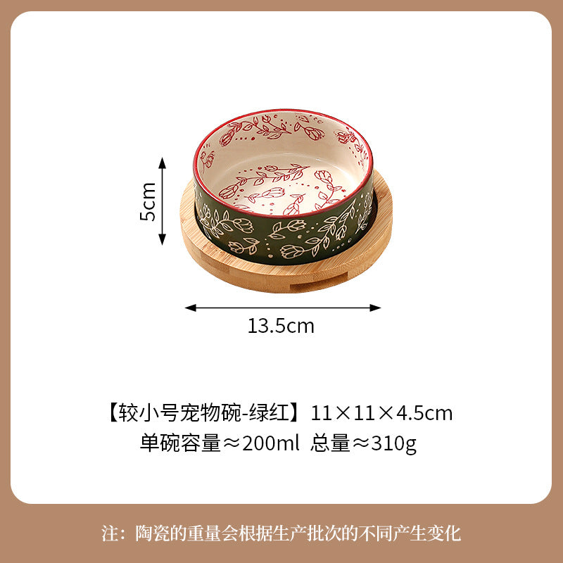 Ethnic Style Ceramic Pet Bowl with Bamboo Tray β Anti-Knock Dog &
