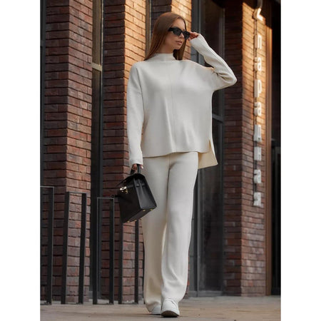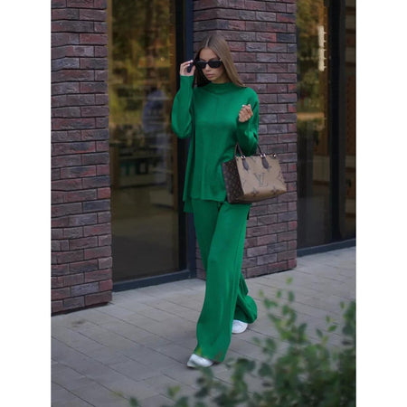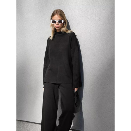 ✨ Step into effortless elegance with this European and American cross-border knitted suit for women. The set includes a loose slit half-turtleneck sweater and straight wide-leg pants, combining comfort and high-street style.