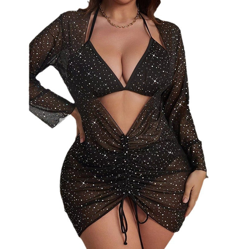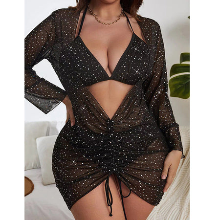 Feel confident and chic with our Women’s Plus Size Three-Piece Swimsuit Set. Featuring a long-sleeve top, triangle bikini, and a matching skirt, this set is perfect for sun protection and stylish comfort.