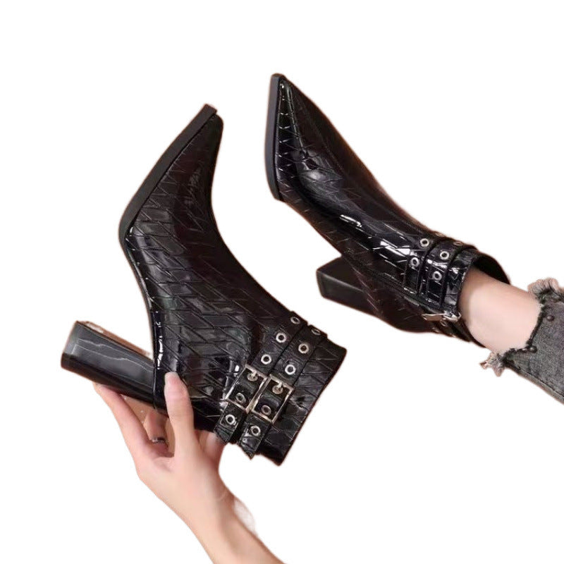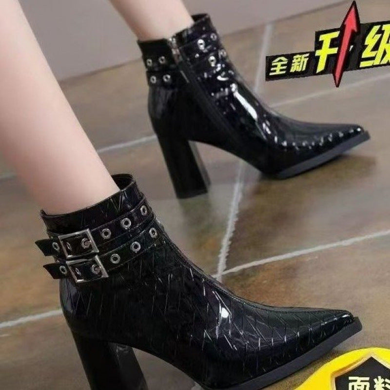 European-Style Black Sexy Ankle Boots for Women. Designed for spring 2024, these boots feature a pointed toe, high stiletto heel, side zipper, and buckle with stud detailing, combining sophistication and modern fashion. Made from premium leather, they provide both style and durability for any occasion.