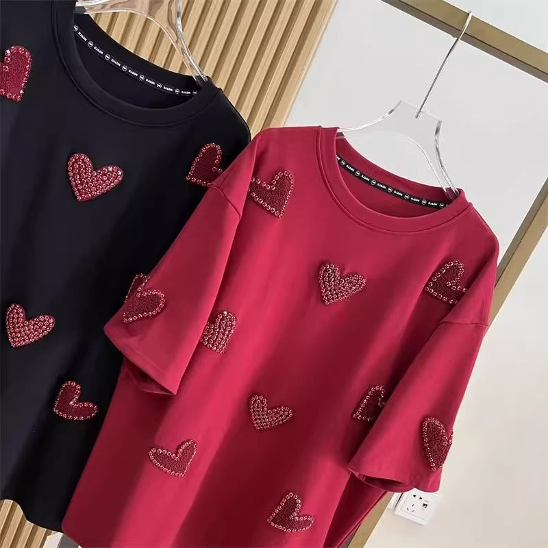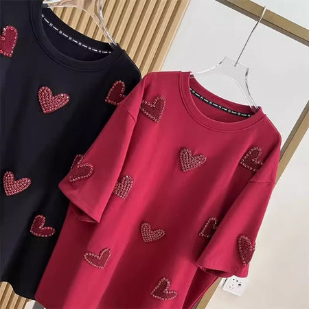 Celebrate comfort and style with this extra-large plus size short-sleeved T-shirt, designed to fit women weighing between 1.0 kg and 150 kg. Crafted from soft, breathable cotton fabric, this loose top features a unique heavy industry stereo heart towel embroidery and elegant beaded details that add a touch of sophistication to your casual look.