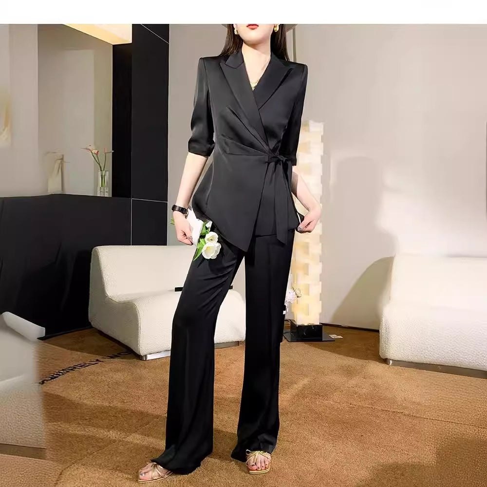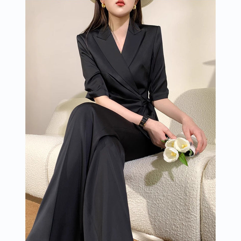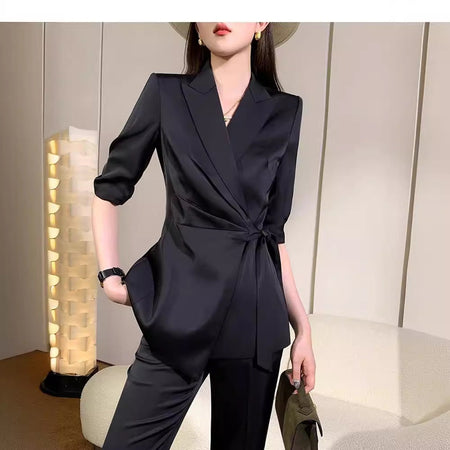 Chic Two-Piece Design: Matching blazer and pants create a polished, coordinated look.