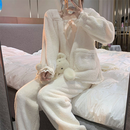 Stay cozy yet feminine with our Women’s Korean-Style Lace Flannel Pajamas Set. This winter-ready coral fleece outfit combines warmth with delicate lace details, giving you both comfort and charm.