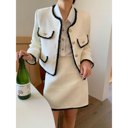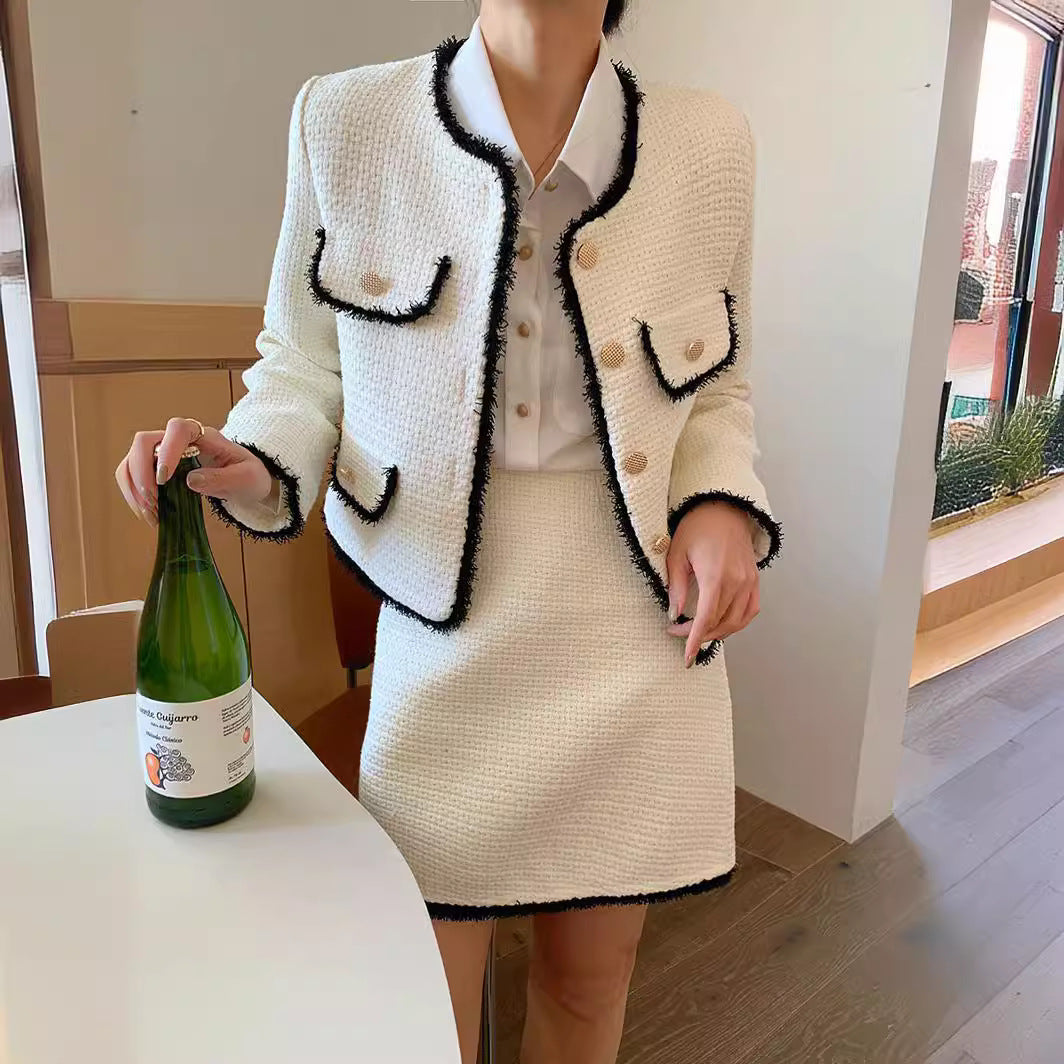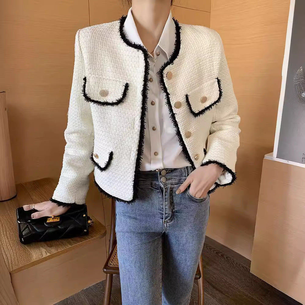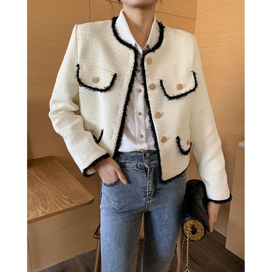 Designed for women who love classic socialite charm and polished fashion, this white short suit jacket combines luxurious tweed texture with chic tailoring, creating a refined and versatile wardrobe essential.