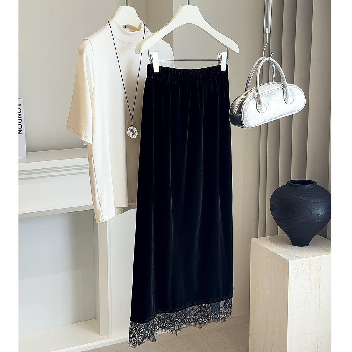 Chic and elegant, this Velvet Lace Midi Skirt adds French-inspired sophistication to your autumn and winter wardrobe. With its lace splicing, sleek velvet texture, and side slit, it’s the perfect blend of classic charm and modern femininity.