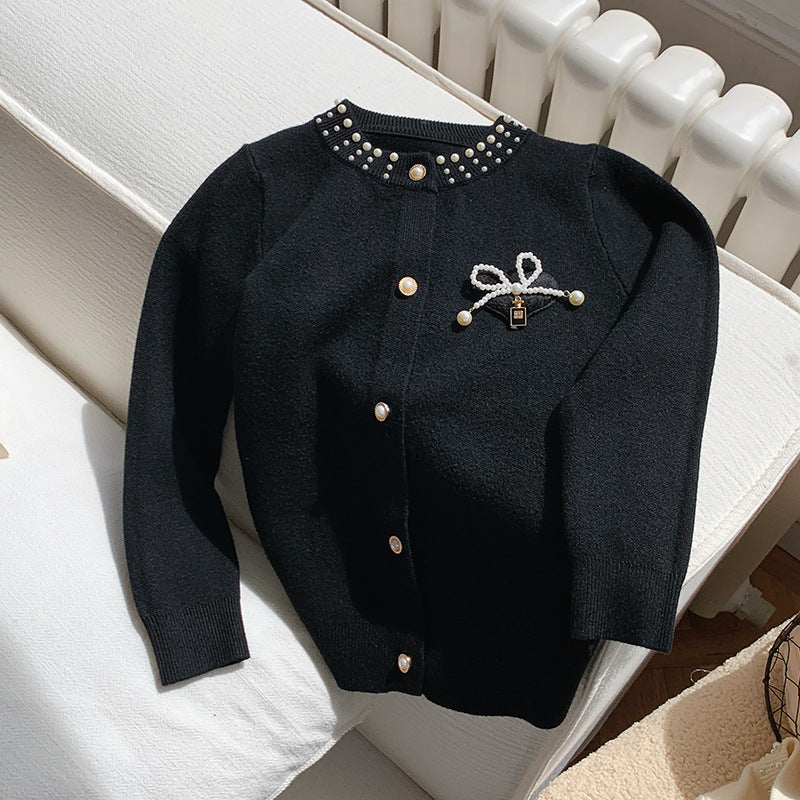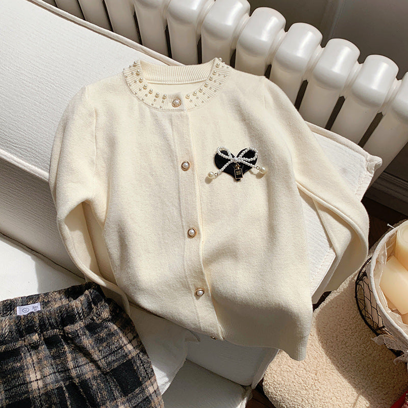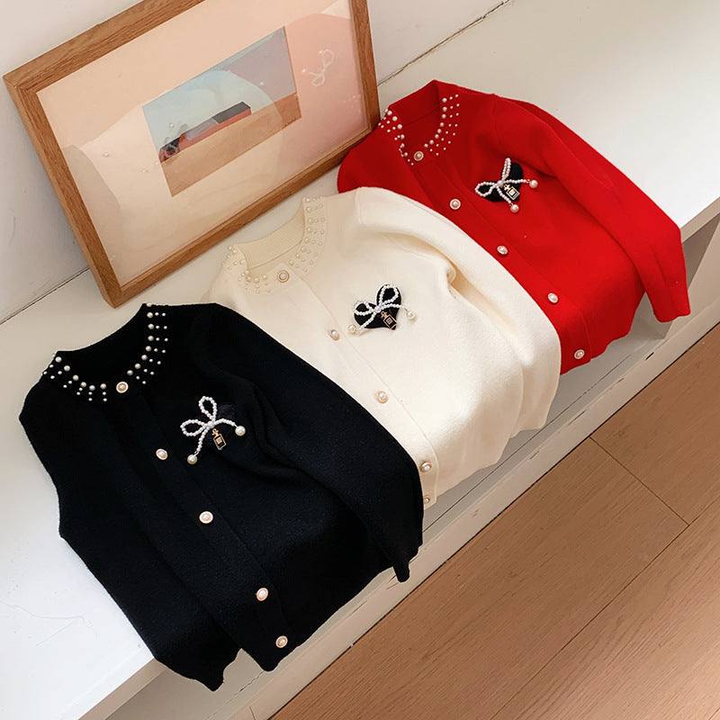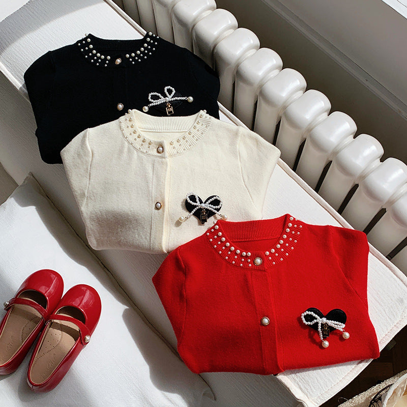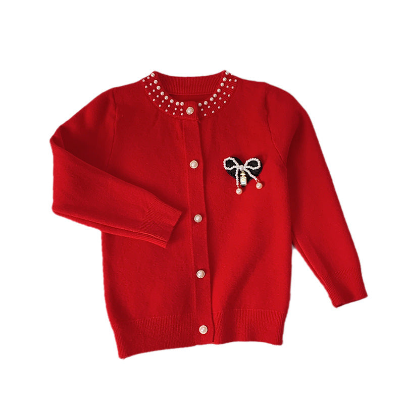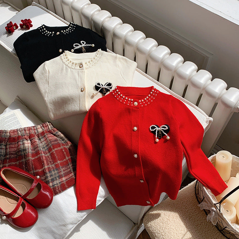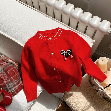 Girls’ Red Pearl Bow Sweater Cardigan Autumn Winter 2025